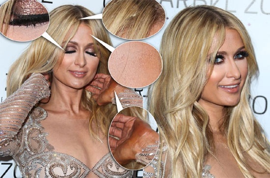 | Cô nàng lắm chiêu Paris Hilton bị thất bại trong phong cách trang điểm với lông mi giả quá dài, tóc nối lộ liễu, nền da mặt và tay thì khác nhau một trời một vực. |