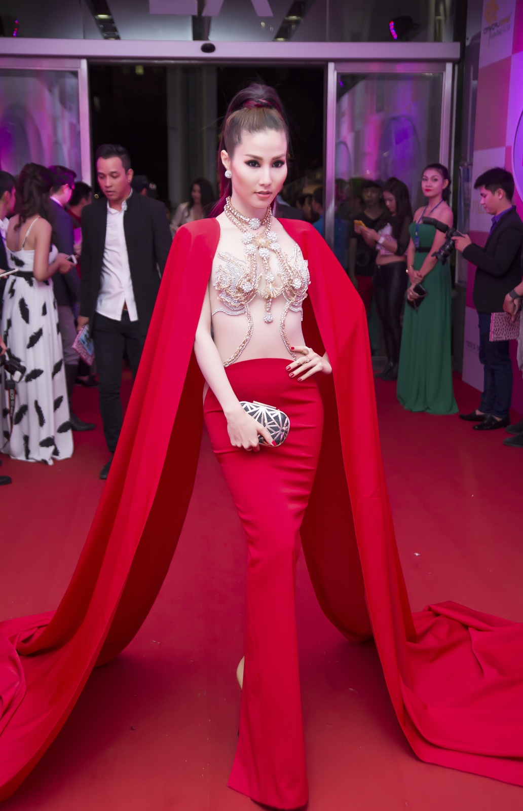 | Thiết kế có phom dáng ôm sát, gợi đường cong, dáng tay cape thêm phần lộng lẫy. Điểm nhấn tại thân áo được cách điệu bằng chi tiết đính cườm cầu kỳ. Đi kèm là tông trang điểm sắc sảo, mái tóc cột cao cá tính. |