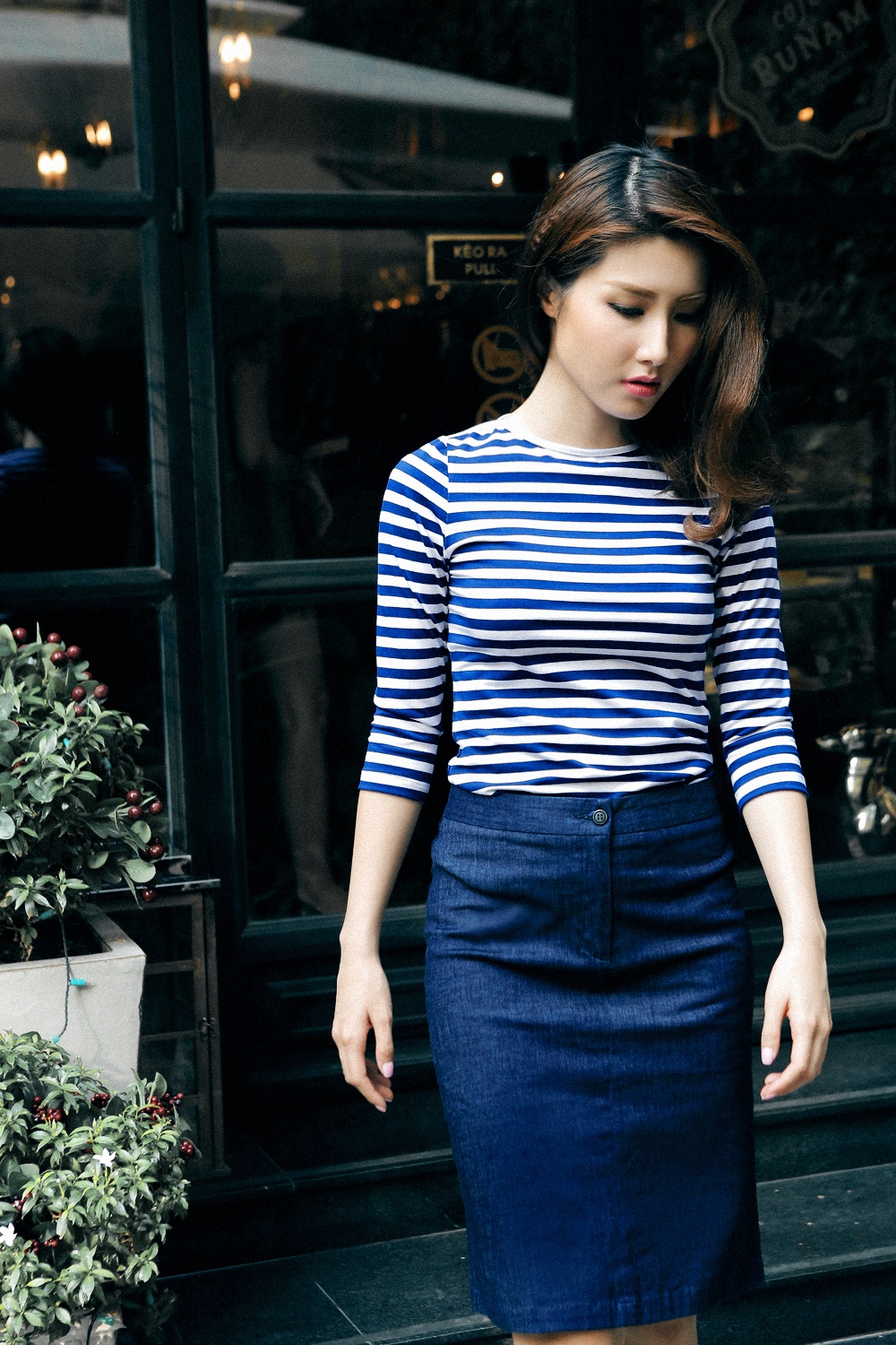 | Trong bộ hình vừa hoàn thiện, nữ diễn viên Tốc độ & Đường cong hướng đến phong cách thời trang tối giản. Bộ váy suông tông xanh cô-ban thanh lịch giúp người đẹp nổi bật trên con phố cổ điển trung tâm Sài Gòn. |