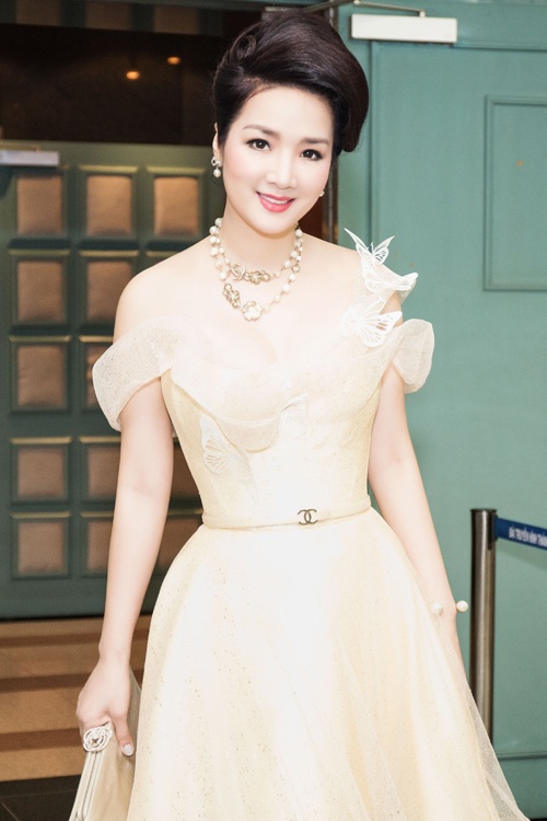| Đầm nữ tính tông vàng nhạt mang đến hình ảnh trẻ trung, cuốn hút cho Hoa hậu đền Hùng - Giáng My. Phụ kiện vòng cổ ngọc trai duyên dáng, kiểu tóc quý phái hợp gương mặt nhẹ nhàng. Ảnh: Tân Đà Lạt |