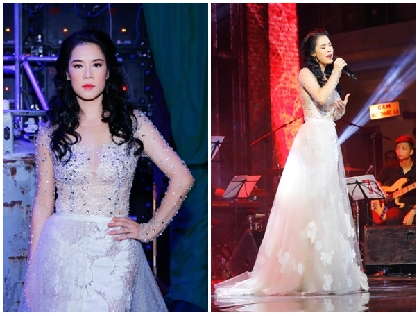 Trên sân khấu live show Mùa thu của Phương diễn ra ở Hải Phòng, HLV The Voice 2015 - Thu Phương cuốn hút trong các thiết kế của Hoàng Hải. Đầm tông trắng voan mỏng, kết hạt tinh tế ở thân áo và chân váy tôn vóc dáng cân đối của bà mẹ 4 con. Ảnh: Alec.