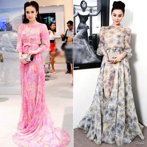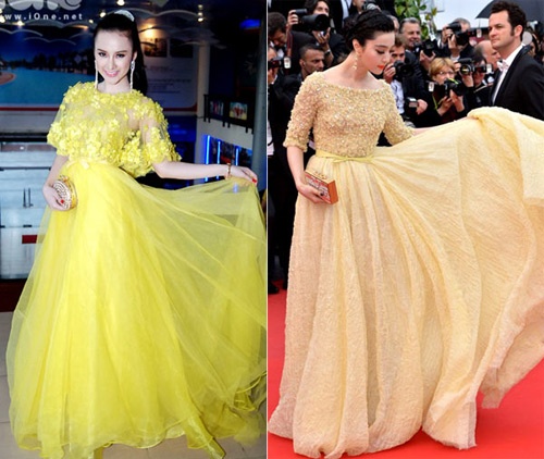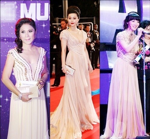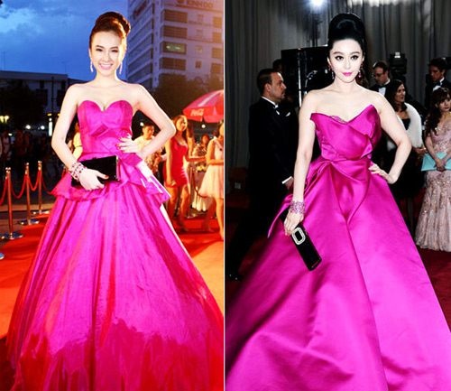 | Việt Trinh và hoa hậu Giáng My cùng đụng váy với Phạm Băng Băng tuy nhiên cả hai đều diện hàng nhái. |