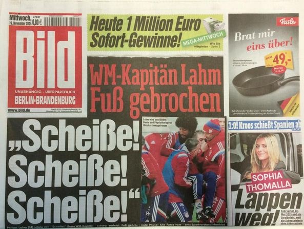 Hình ảnh trang bìa gây sốc của tờ Bild vừa được đăng lại trên trang Metro.co.uk. Tờ báo của Đức đã dùng những ngôn từ tục tĩu khi nói về chấn thương của cựu thủ quân tuyển Đức, Philipp Lahm. Trước đó, hậu vệ đa năng 31 tuổi đã bị vỡ mắt cá trong buổi tập của Bayern. Theo bộ phận y tế tại Allianz Arena, Lahm sẽ phải ngồi chơi xơi nước trong vòng 3 tháng.