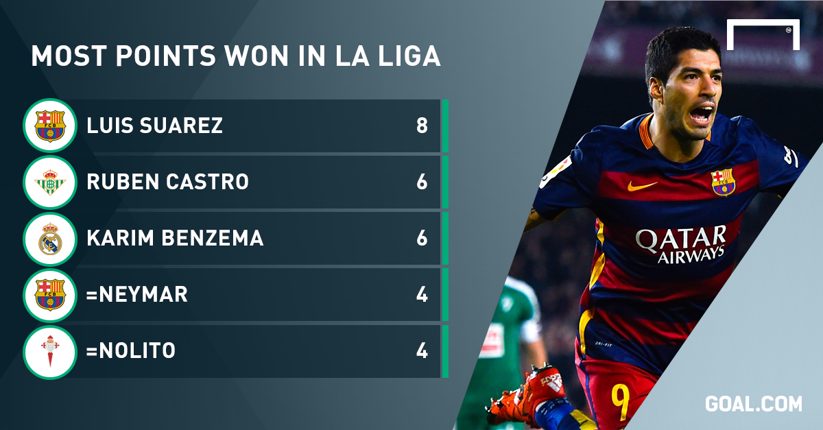 Theo thống kê từ Opta, tiền đạo Luis Suarez là cầu thủ mang về nhiều điểm nhất cho CLB của mình tại giải năm nay. Cụ thể, trung phong người Uruguay đóng góp 8 điểm cho Barca từ những bàn thắng mang tính quyết định. Ruben Castro và Karim Benzema chia sẻ vị trí thứ 2 khi mang về cho Betis và Real Madrid cùng 6 điểm. Trong khi dù ghi 7 bàn như Suarez từ đầu mùa, Cristiano Ronaldo vẫn không có tên trong Top 5. Lionel Messi cũng chưa có đóng góp đáng kể nào cho Barca vì dính chấn thương.