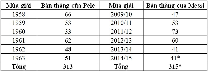 Với hat-trick vào lưới Vallecano trong trận đấu ngày 8/3, Lionel Messi nâng tổng số bàn thắng trong 6 mùa giải liên tiếp ở Barca lên 315 bàn. Thành tích này giúp siêu sao người Argentina phá kỷ lục của huyền thoại Pele. "Vua bóng đá" từng ghi 313 bàn cho Santos từ năm 1958 đến 1963.