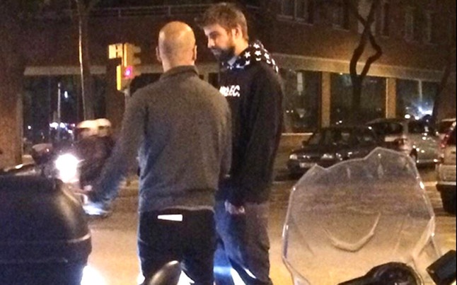| Pique bị bắt gặp đang trò chuyện cùng Pep Guardiola cuối tuần qua. |