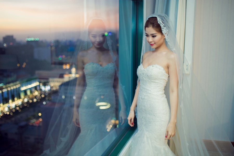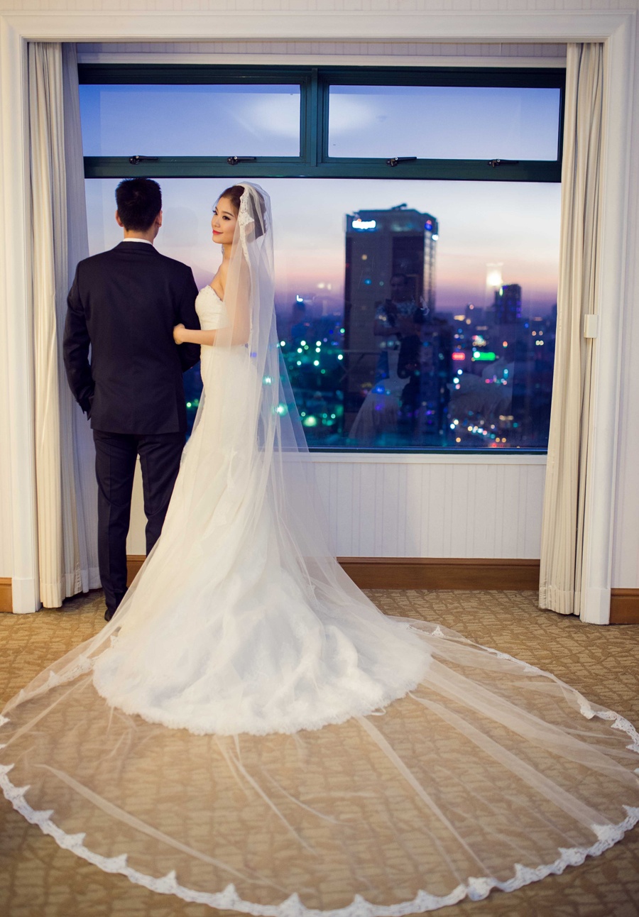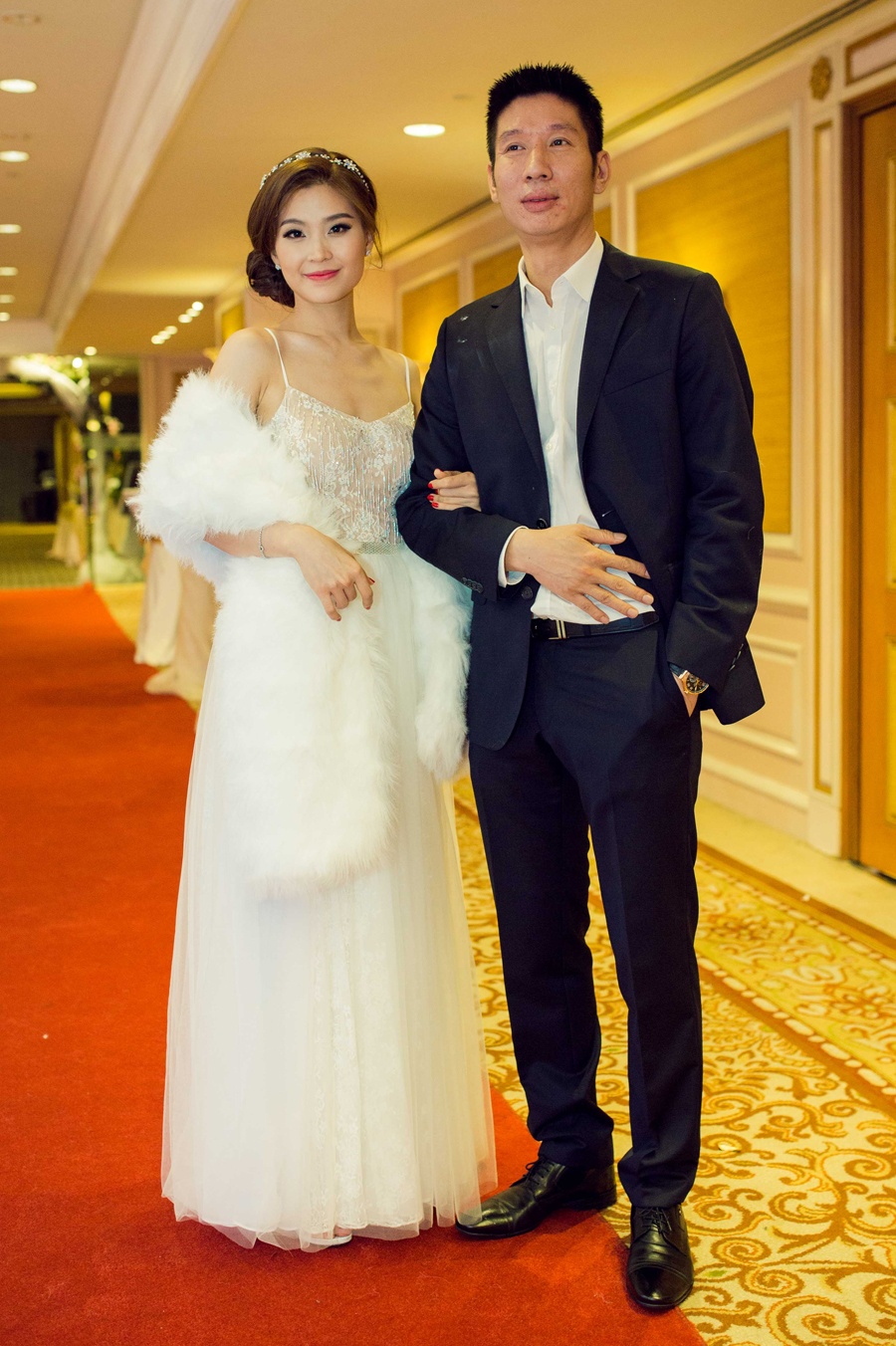 Trong hôn lễ ngày 26/12, tại TP HCM, Á hậu Việt Nam 2014 diện ba bộ đầm cưới trắng, gồm một thiết kế thuộc thương hiệu nước ngoài và hai mẫu váy do bạn thân thiết kế.