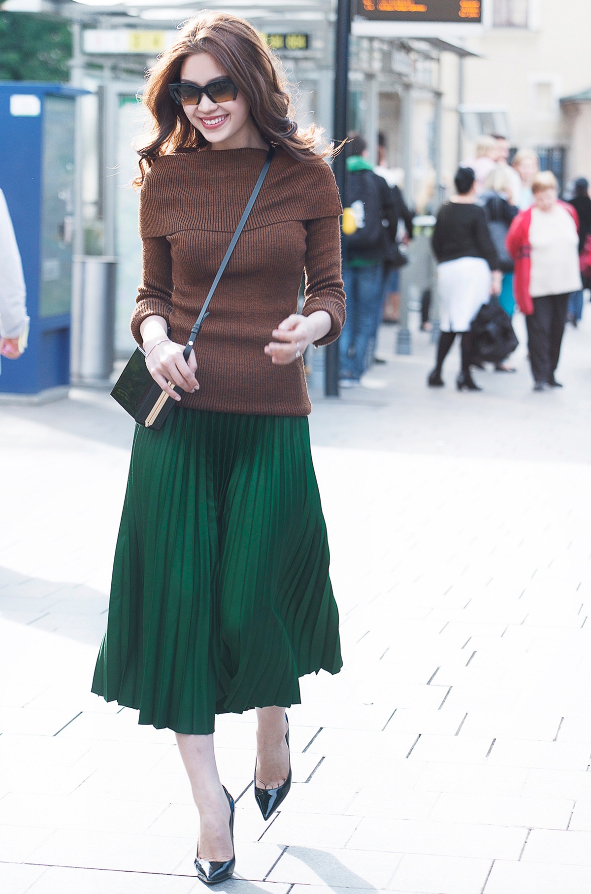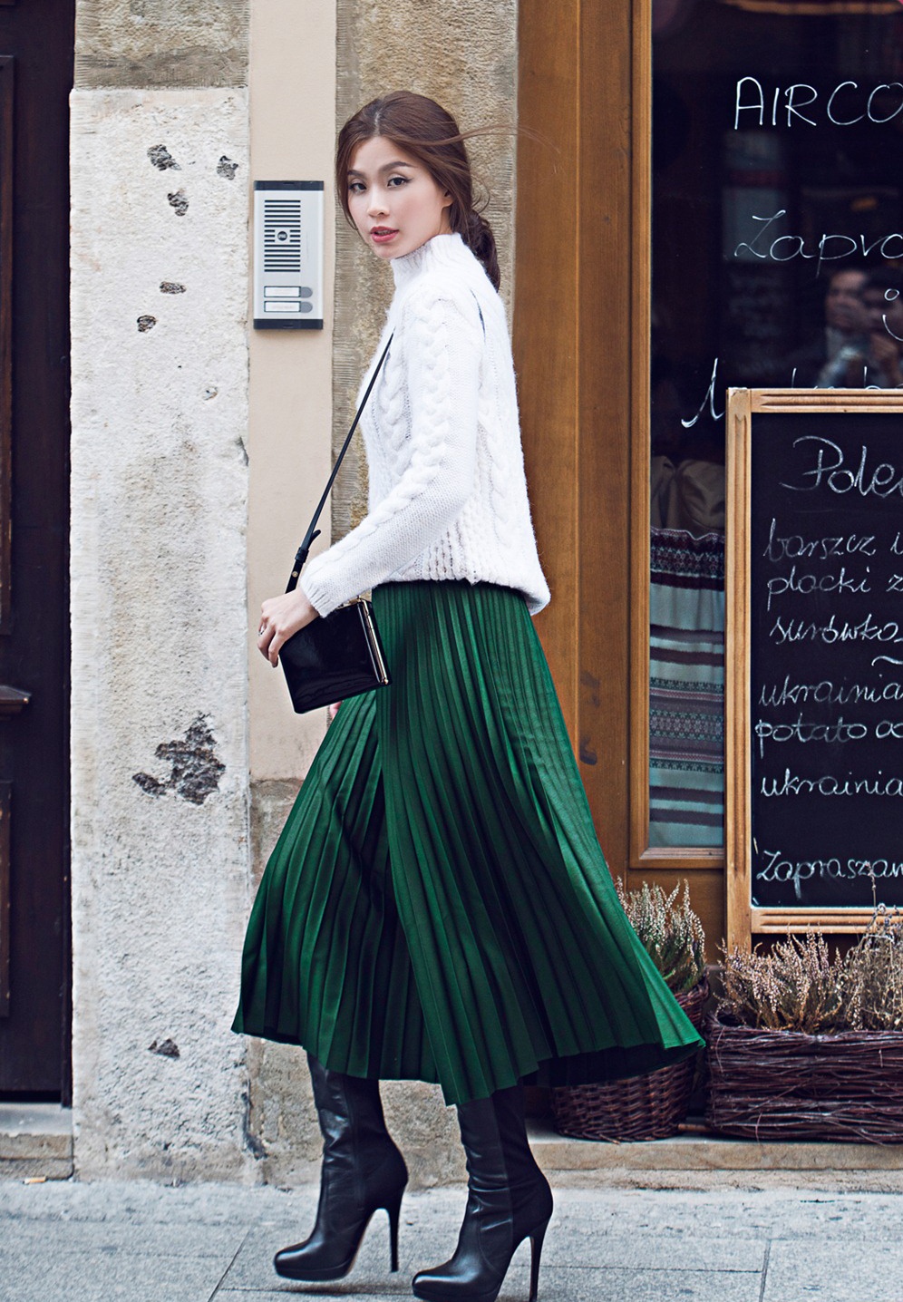 | Với váy xếp ly xanh lá trầm, người đẹp có nhiều cách chọn áo đi kèm. Trong ảnh, áo len trắng vừa tạo phong cách cổ điển vừa giúp cô giữ ấm. |