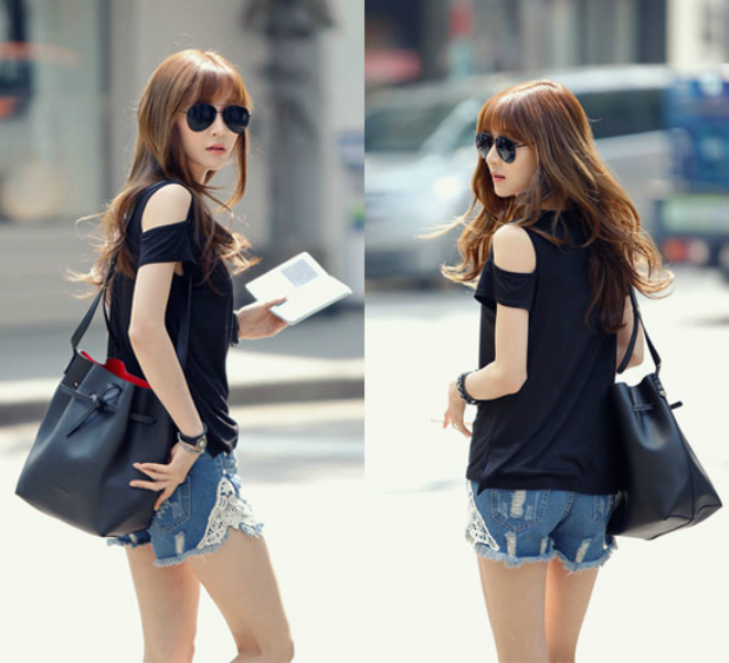 | Áo khoét vai là kiểu trang phục mix đồ khá dễ. Bạn có thể thỏa sức sáng tạo khi kết hợp với quần shorts khỏe khoắn, quần jeans cá tính hay cả những chân váy điệu đà. |