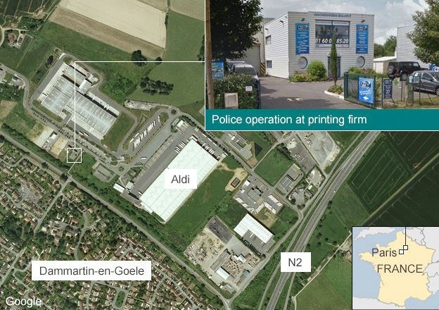 | Xưởng in CTD (tên đầy đủ là Création Tendance Découverte) là nơi hai nghi phạm vụ tấn công tòa soạn báo ở Paris cố thủ. Người dân địa phương cho biết tòa nhà là xưởng in nhỏ quy mô gia đình. Thường có 5 người làm việc trong đó. Các trường học bên trong và bên ngoài thị trấn Dammartin-en-Goele đã ngừng hoạt động và học sinh về nhà để phòng trường hợp bọn khủng bố tấn công trường học. Telegraph cho biết, những kẻ khủng bố khẳng định chúng muốn chết như những kẻ anh hùng khi nói chuyện với các đàm phám viên ở khu vực giam giữ con tin. Sau một thời gian đàm phán bất thành, cảnh sát đã tấn công tiêu diệt hai nghi phạm, giải thoát con tin. Ảnh: BBC |
