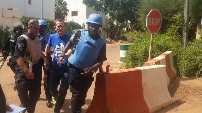 | Lực lượng an ninh đưa một người trong khách sạn tới chỗ an toàn. Trong một tuyên bố trên Twitter, nhóm phiến quân Al-Mourabitoun liên hệ với al-Qaeda nhận trách nhiệm về vụ tấn công khách sạn tại Mali, theo Reuters. Al-Mourabitoun là nhóm phiến quân Hồi giáo ở châu Phi. Đại bản doanh của chúng nằm tại miền bắc Mali.. Ảnh: BBC |