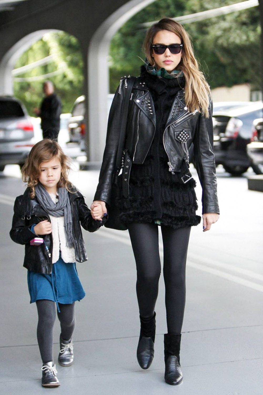 | “Thiên thần bóng tối” Jessica Alba cá tính khi diện nguyên cây đen với đầm liền, áo khoác da và bốt da phối nhung khi dạo phố với con gái. |