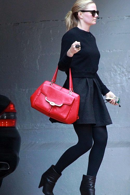 | Jennifer Morrison sử dụng túi đỏ nổi bật cho set đồ đen của mình. |