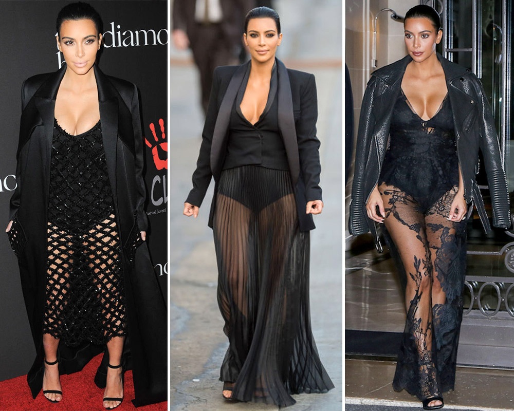 | Kim Kardashian lại khoe thân hình gợi cảm khi diện nguyên bộ đồ đen tham dự sự kiện với váy xuyên thấu, nhưng vẫn ấm áp cùng suit hoặc áo khoác da. |