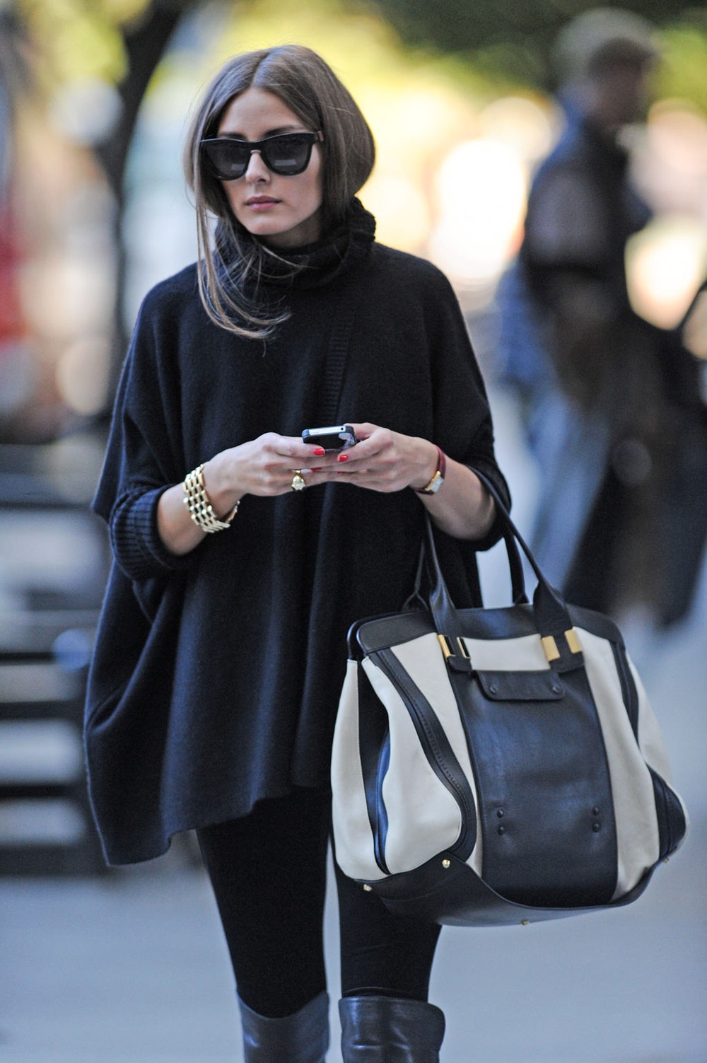 | Olivia Palermo chọn áo choàng poncho làm điểm nhấn cho set đồ tông đen. |