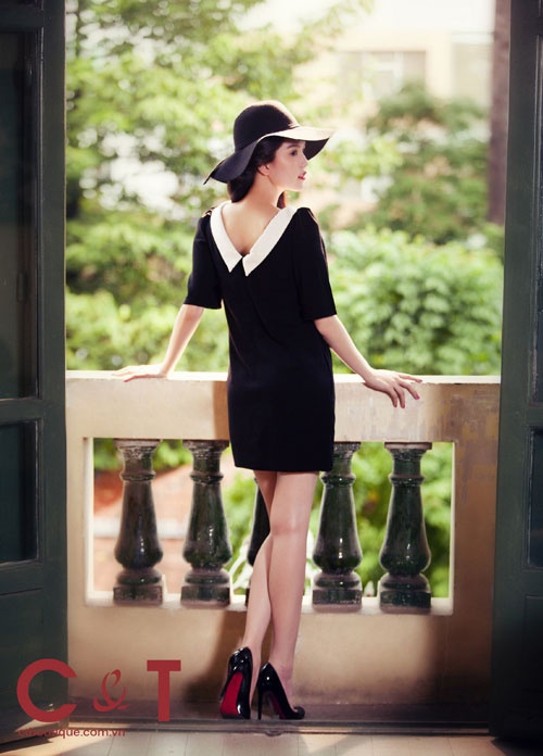 Cũng có lúc cô sang trọng và quý phái với chiếc đầm đen điểm xuyết hoa trắng rất lạ mắt.