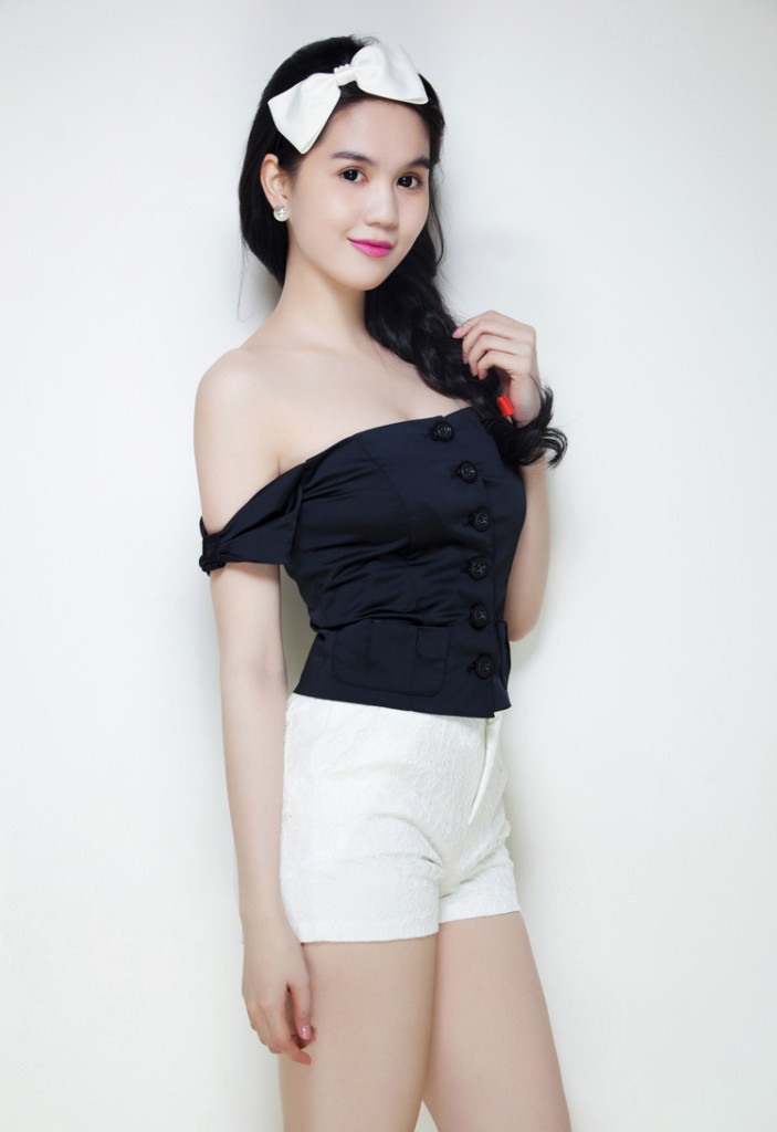| Hay không kém phần ngây thơ với chiếc áo đen trễ nải phối cùng shorts và nơ trắng. |