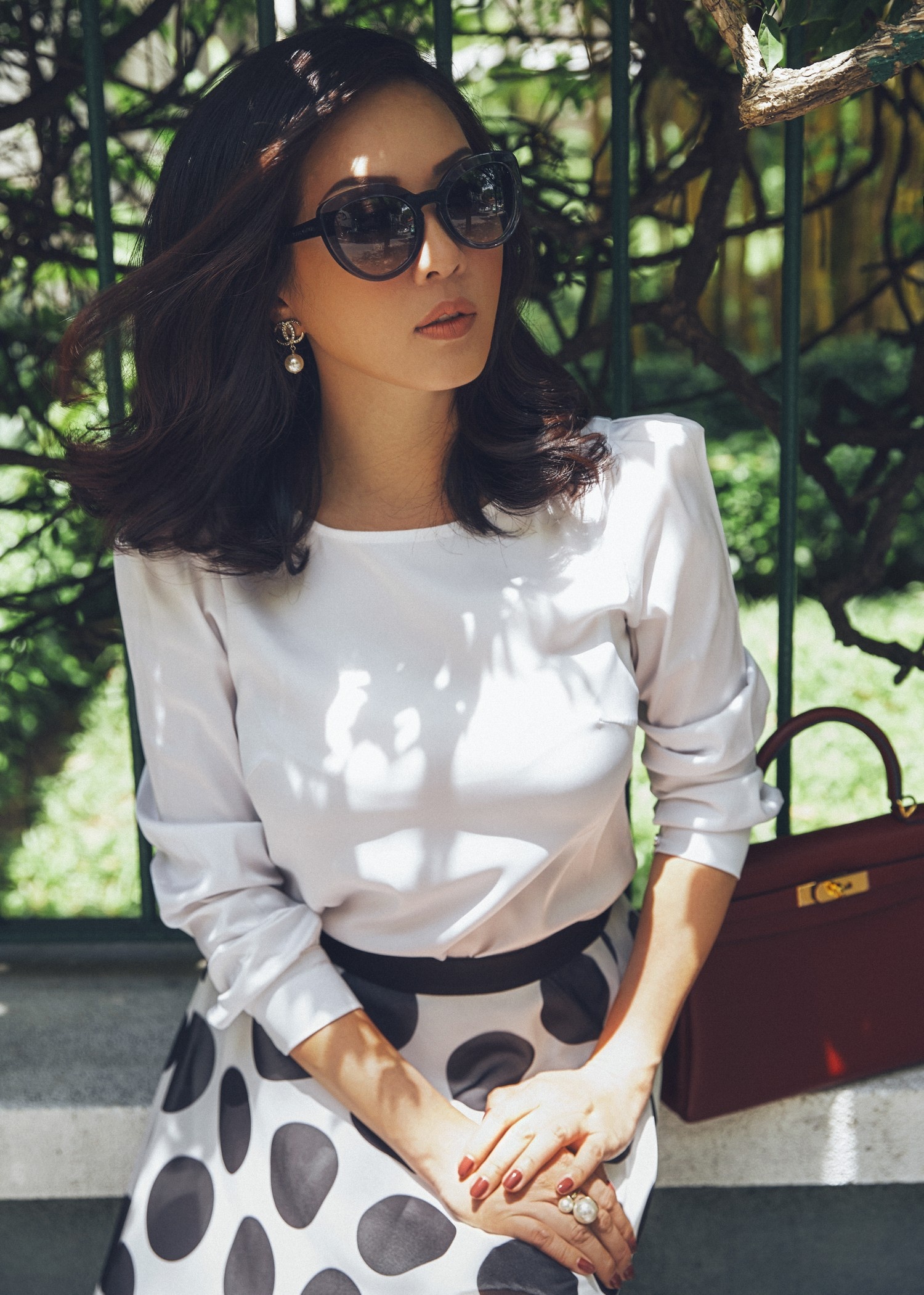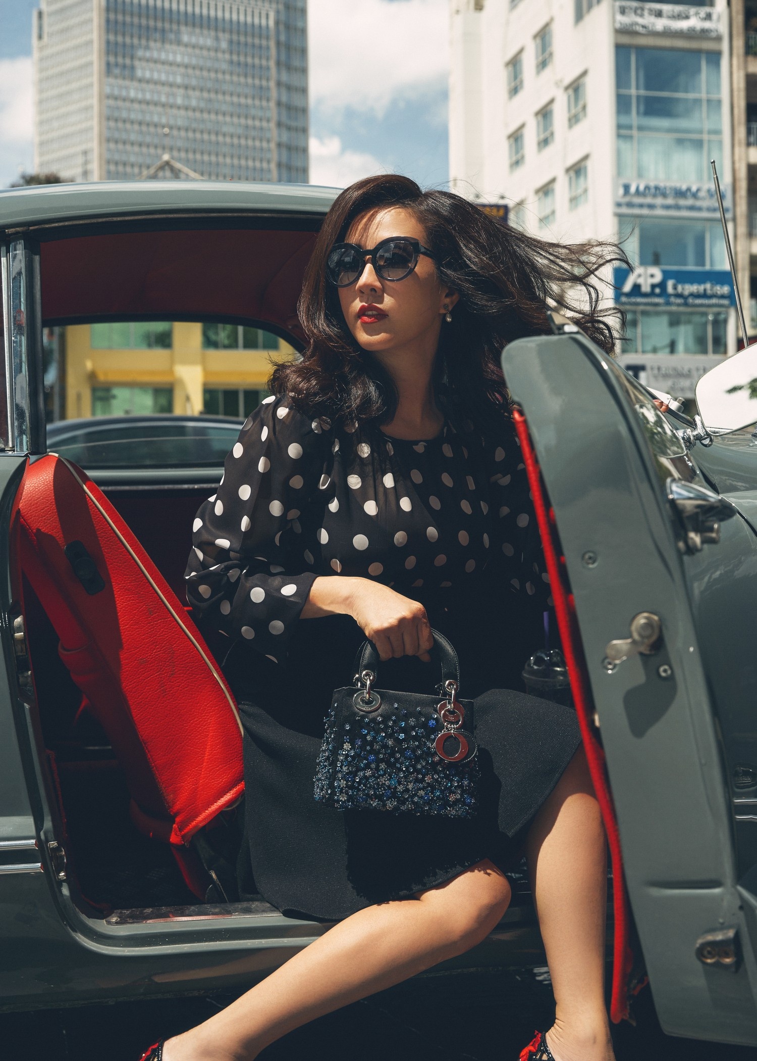 Vốn có gu ăn mặc sành điệu, hoa hậu Thu Hoài trở nên ấn tượng khi kết hợp những bộ váy họa tiết chấm bi đơn giản kết hợp với những chiếc túi xách sang trọng để tạo nên bộ ảnh cổ điển đầy ấn tượng.
