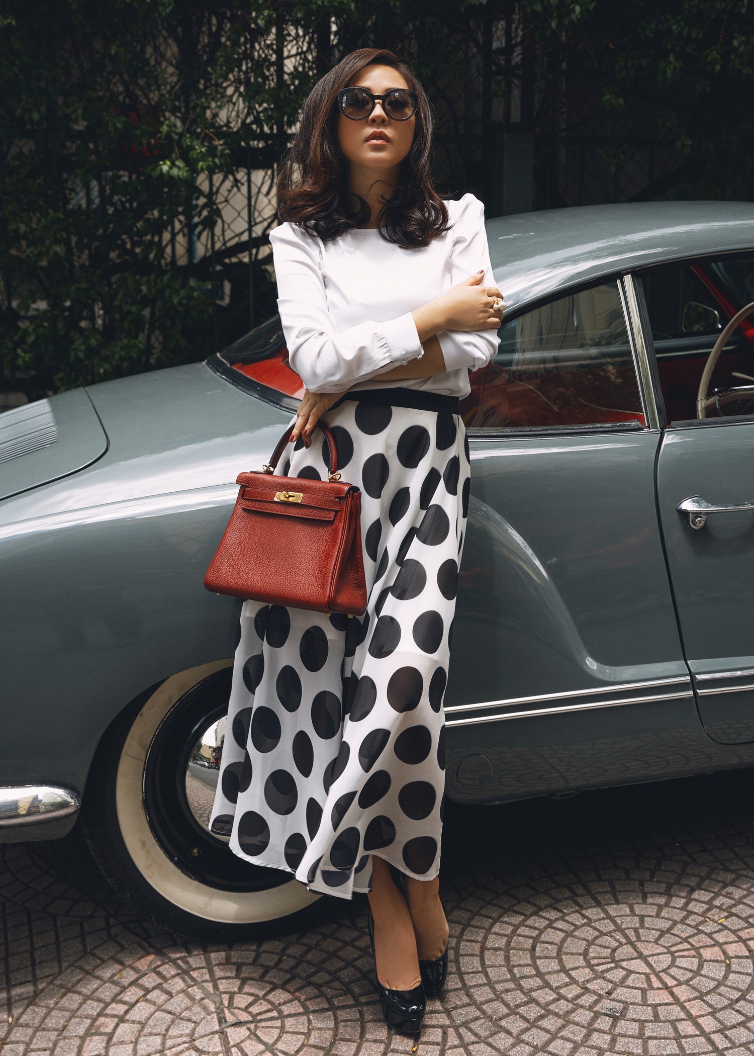 Ở set đồ này, bà mẹ 3 con kết hợp chân váy dài chấm bi cùng áo sơ mi không cổ. Đây là xu hướng thời trang đậm chất cổ điển của thập niên 1960 và được không ít người đẹp lựa chọn trong những năm gần đây.