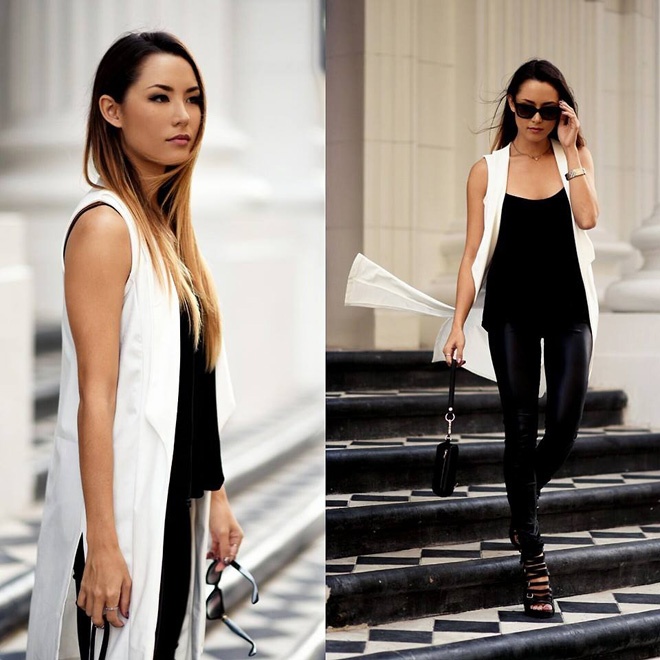 | Cách đơn giản để diện đẹp với kiểu áo thời trang này là đóng bộ nguyên cây đen, kết hợp áo khoác dáng dài màu trắng nổi bật. Các chất liệu phù hợp ngày lạnh như thun, len, da giúp Jessica R, hot blogger nổi tiếng California chất lừ trong mùa rét. |