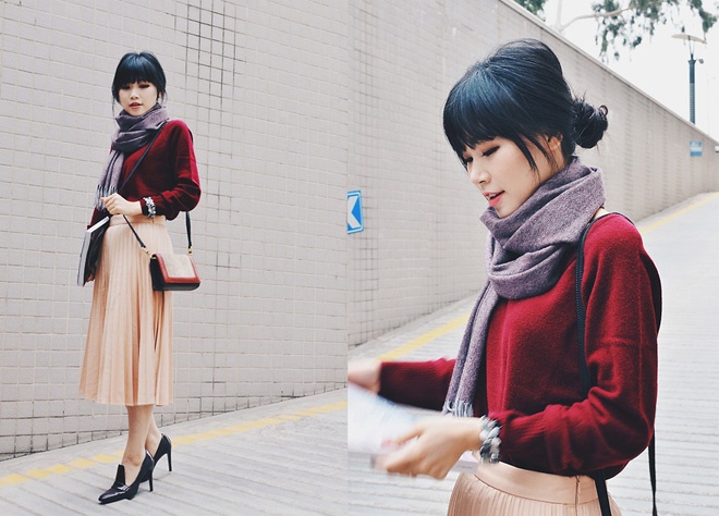 | 2. Áo len oversize và chân váy xòe. Đây là 1 trong những kiểu mix, match cổ điển nhưng không khi nào lỗi mốt khi đông về. |