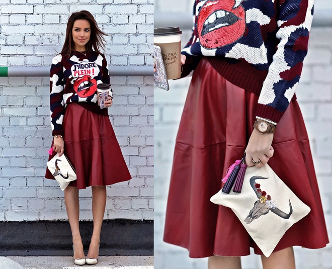 | Cá tính hơn, chân váy midi chất liệu da mix cùng áo len phom rộng, tay dài họa tiết đôi môi xinh xắn sẽ mang lại vẻ khác biệt, lạ lẫm cho bạn tha hồ đón rét. |