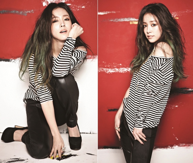 Các cô nàng Orange Caramel trên tạp chí Ize số tháng 4. Kẻ sọc đen trắng luôn đem đến vẻ ngoài hiện đại và thời trang cho người mặc.