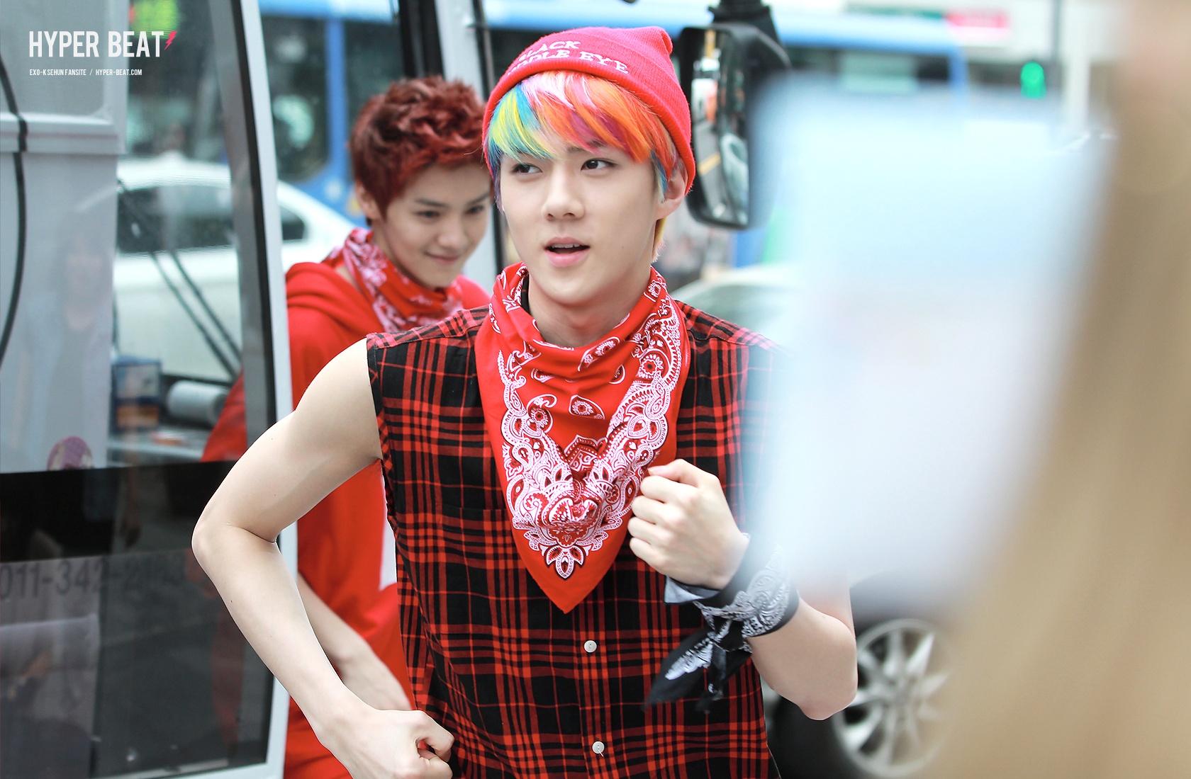 | Sehun của nhóm EXO lại sử dụng khăn bandannas cùng tông với áo sơ mi và mũ len. Bên cạnh đó, để tạo sự khỏe khoắn năng động anh còn dùng bandannas với công dụng như một chiếc băng tay thể thao. |