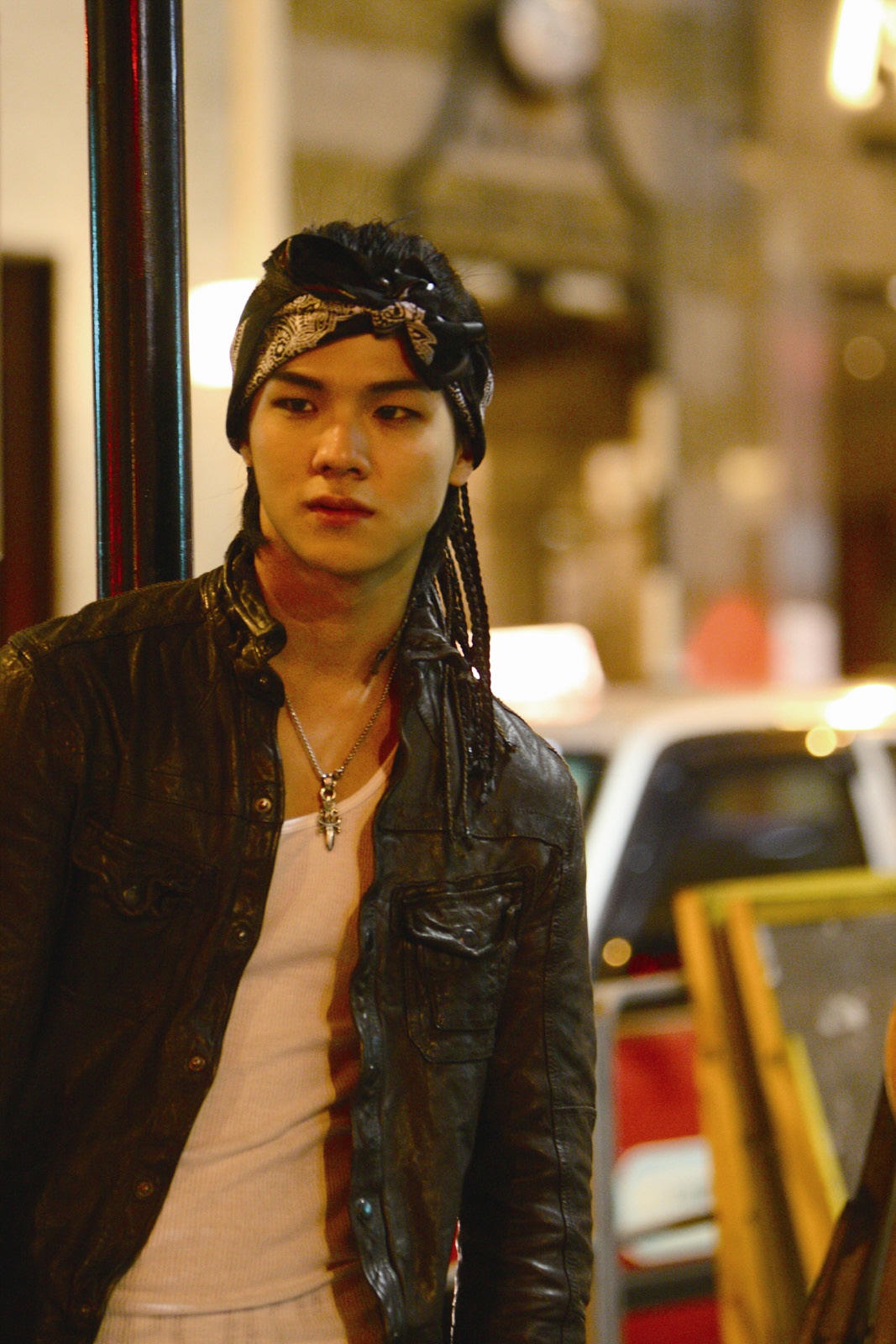 | Với mái tóc luống cày được tết thành nhiều dải nhỏ kết hợp với khăn bandannas CAP của nhóm Teentop như đang tái hiện lại hình ảnh của Tae Yang từ những ngày đầu mới debut. |