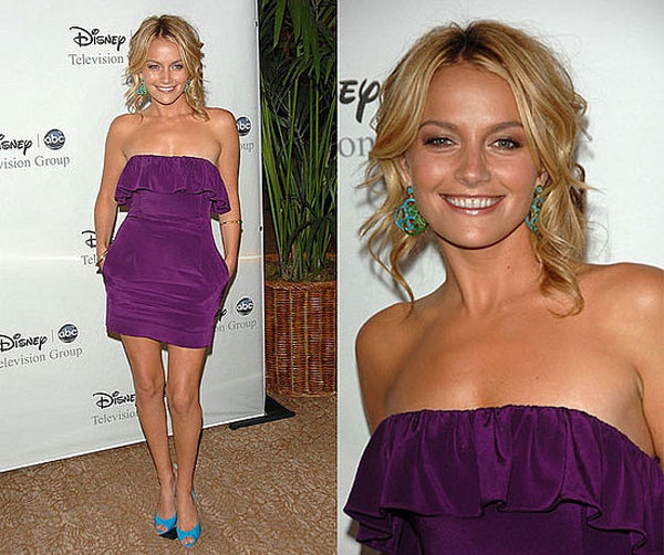 Becki Newton trẻ trung trong chiếc váy tím thiết kế quây và có riềm trước ngực. |