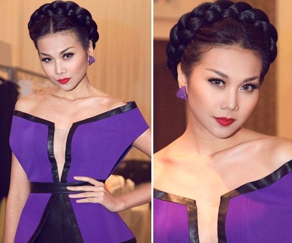 Thanh Hằng rất khéo léo chọn trang phục màu tím đậm kết hợp bông tai gàm cùng màu và trang điểm đậm đà. |