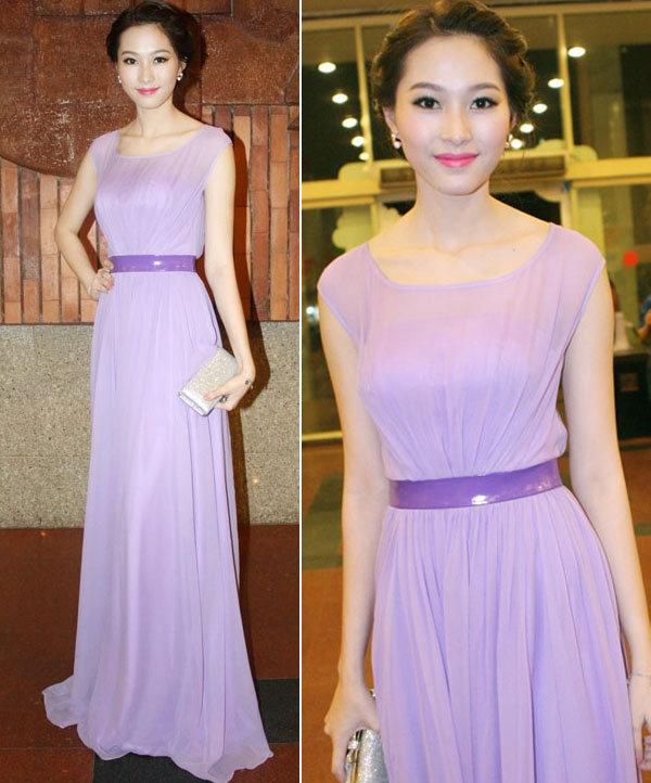 Nếu như gam đỏ mang tới sự nóng bỏng, màu trắng khơi gợi sự tinh khôi thì màu tím lại tạo nên sự đằm thắm, mặn mà vô cùng quyến rũ. Dù là tím nhạt, tím đậm... đều rất cuốn hút khi mặc lên người. Tuy nhiên với gam màu này, khi mặc bạn phải rất thận trọng và tinh tế chọn kiểu dáng, trang điểm, kiểu tóc cho thật phù hợp, nếu không sẽ rất dễ bị già dặn đấy.