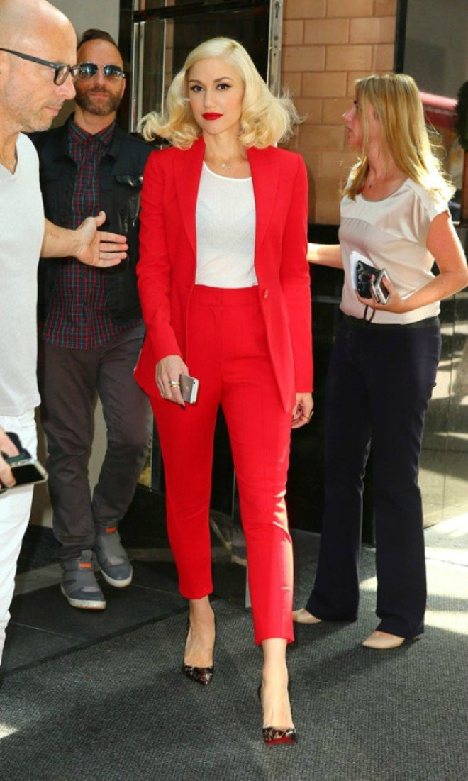 | Gwen Stefani thanh lịch, kín đáo mà không kém phần gợi cảm trong bộ suit màu đỏ đi cùng kiểu make up son môi đỏ hợp tông. |