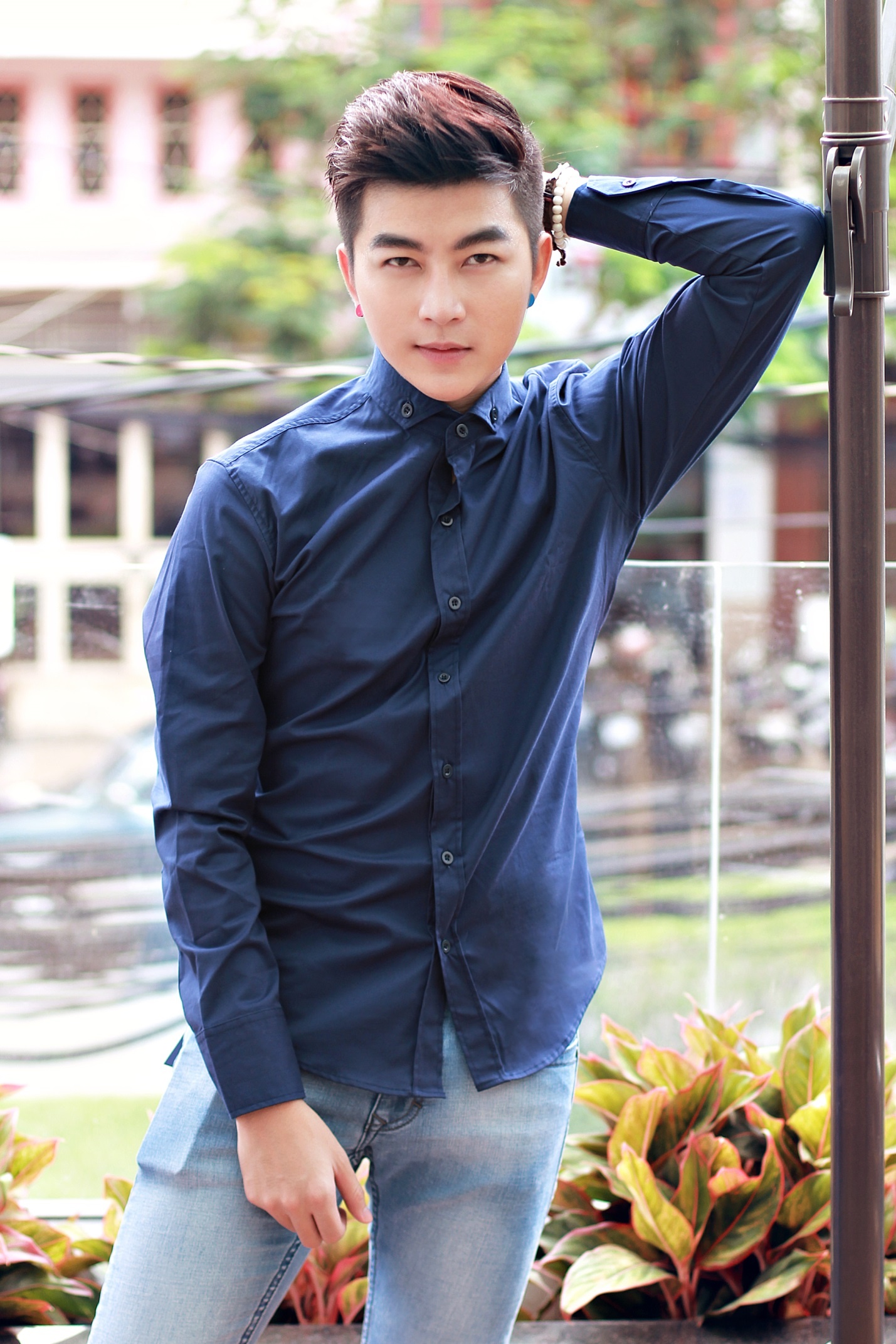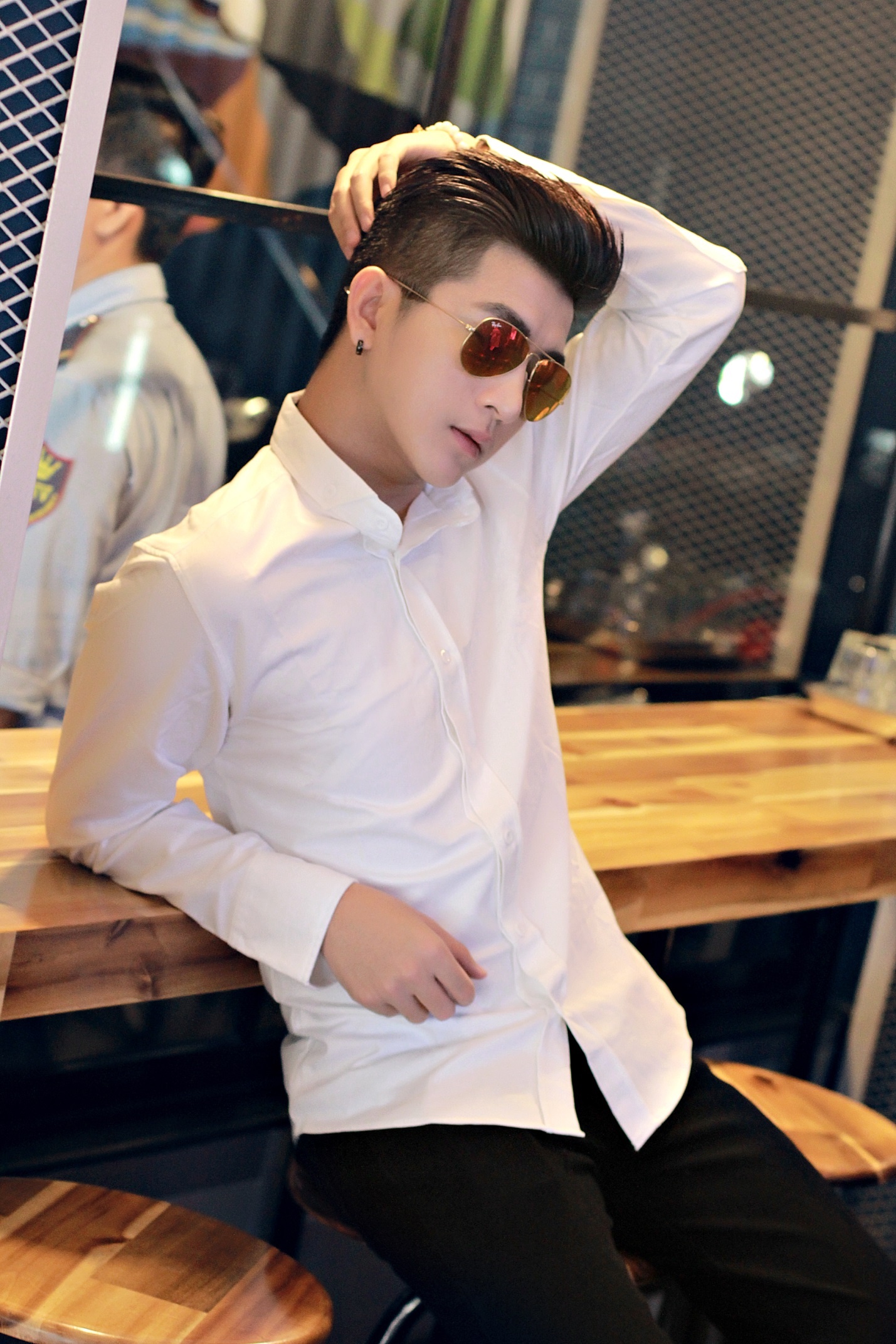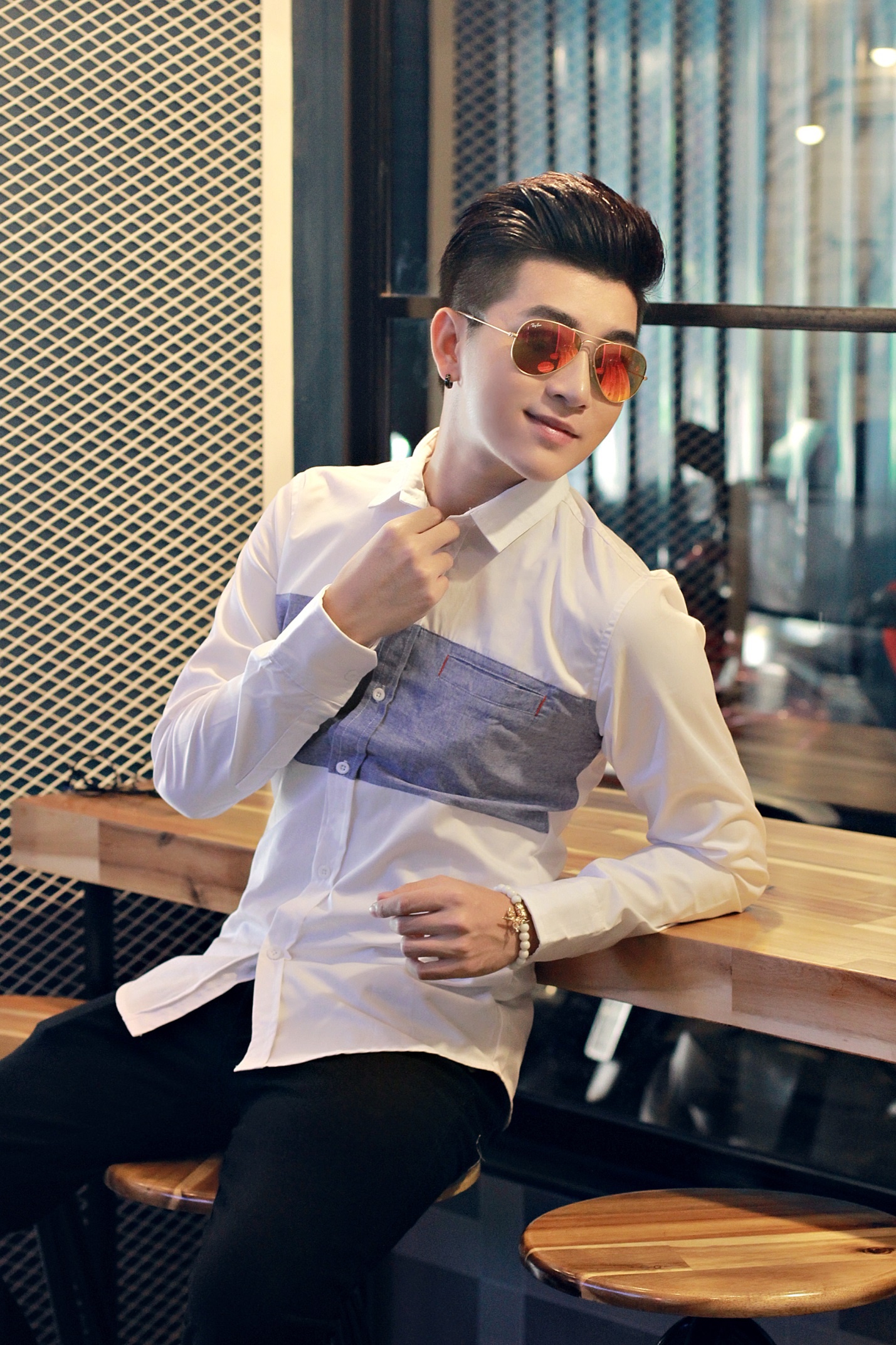 | Những chiếc áo sơ mi tông tối làm anh chàng trở nên thật huyền bí và nam tính. |