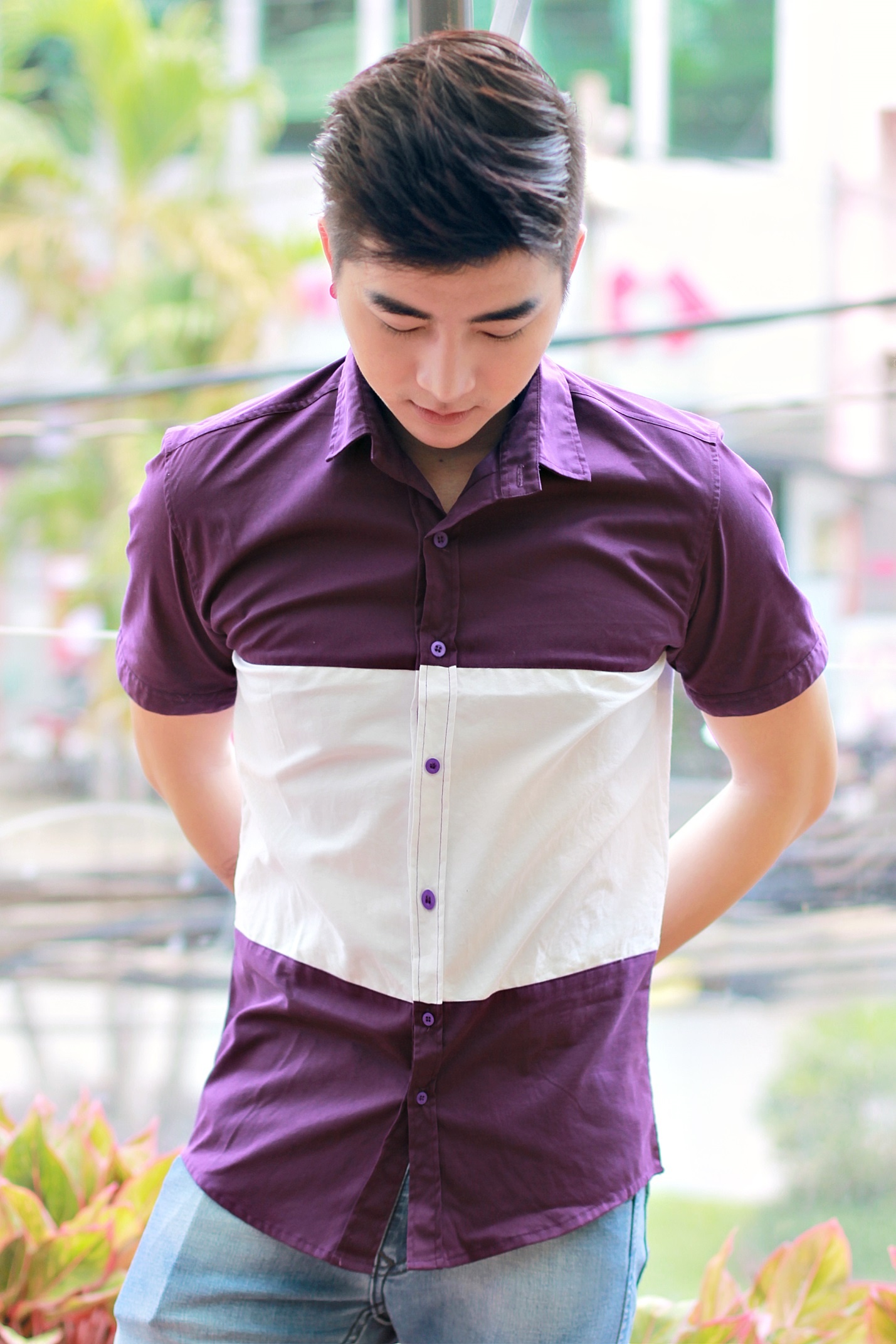 | Nhẹ nhàng với sơ mi tông màu tím. |