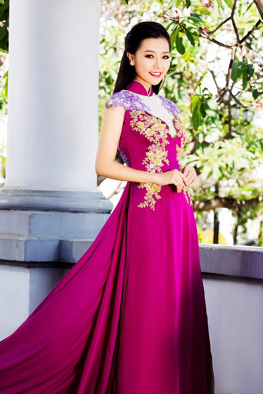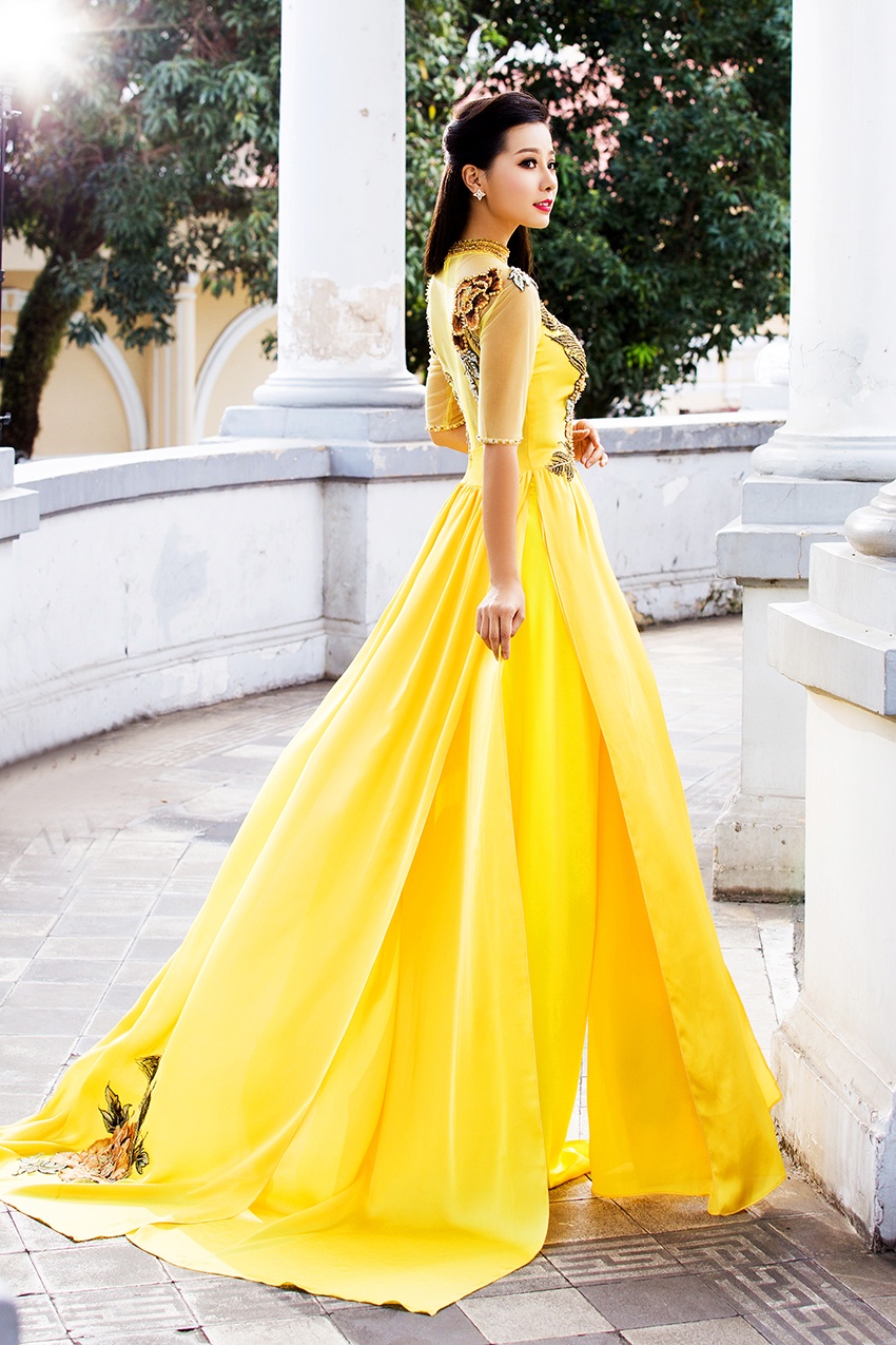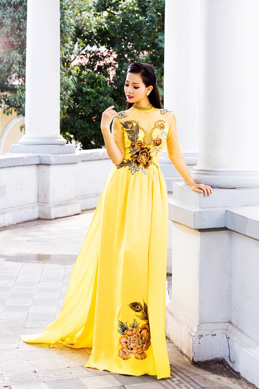Bốn thiết kế áo dài thêu họa tiết cầu kỳ, đậm màu sắc xuân tôn vẻ đẹp thanh tú, duyên dáng của diễn viên sinh năm 1991.