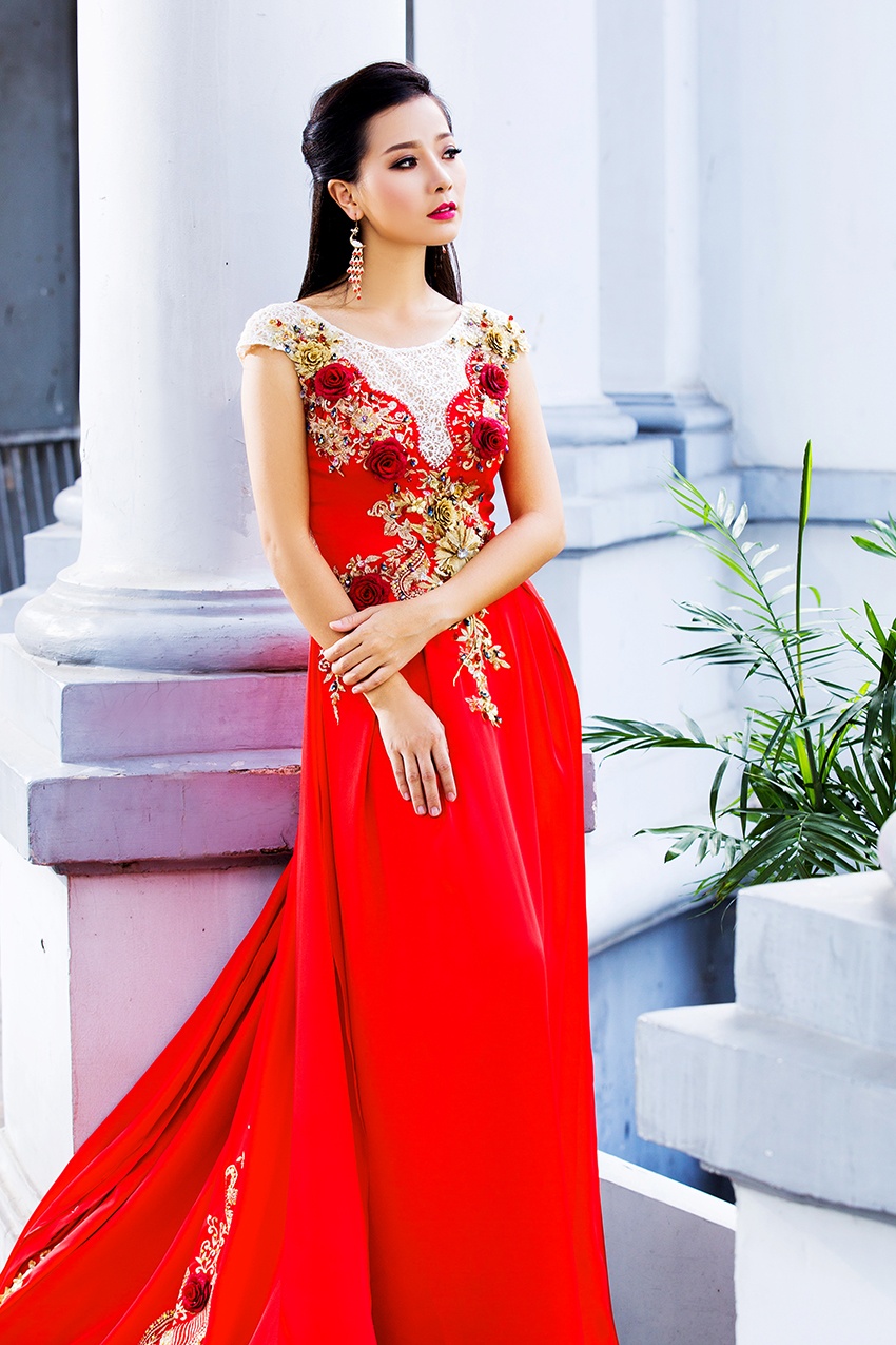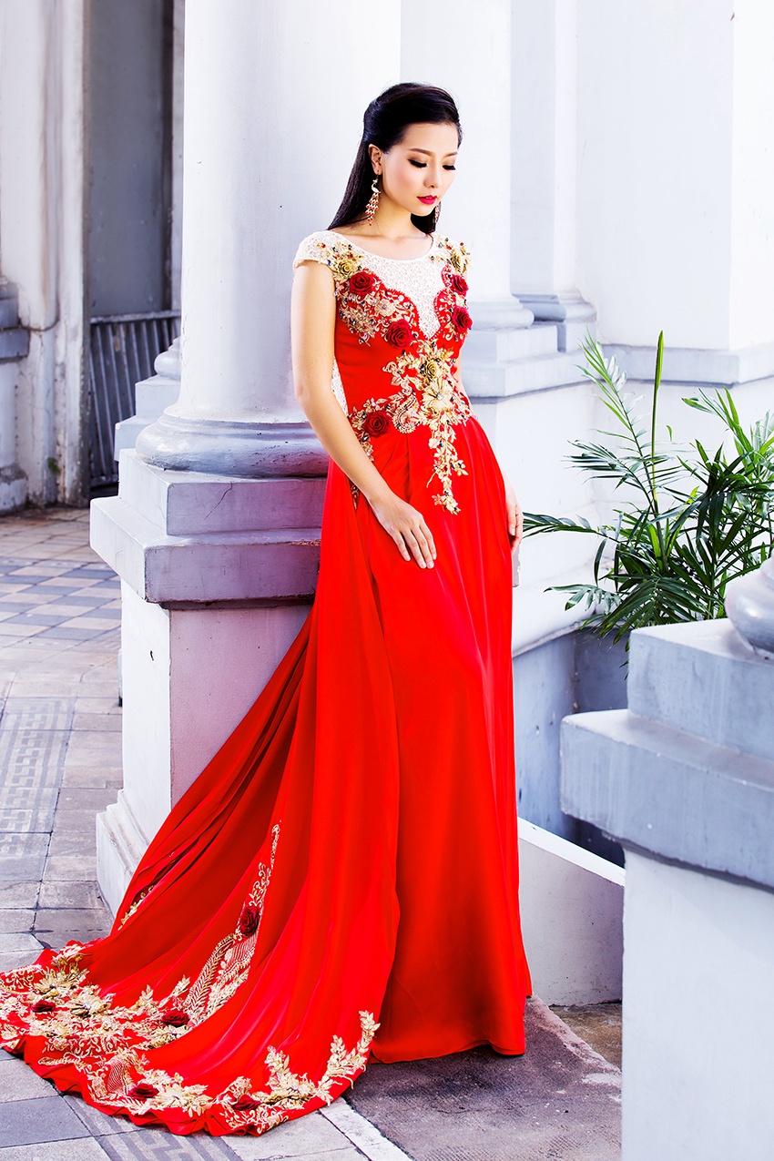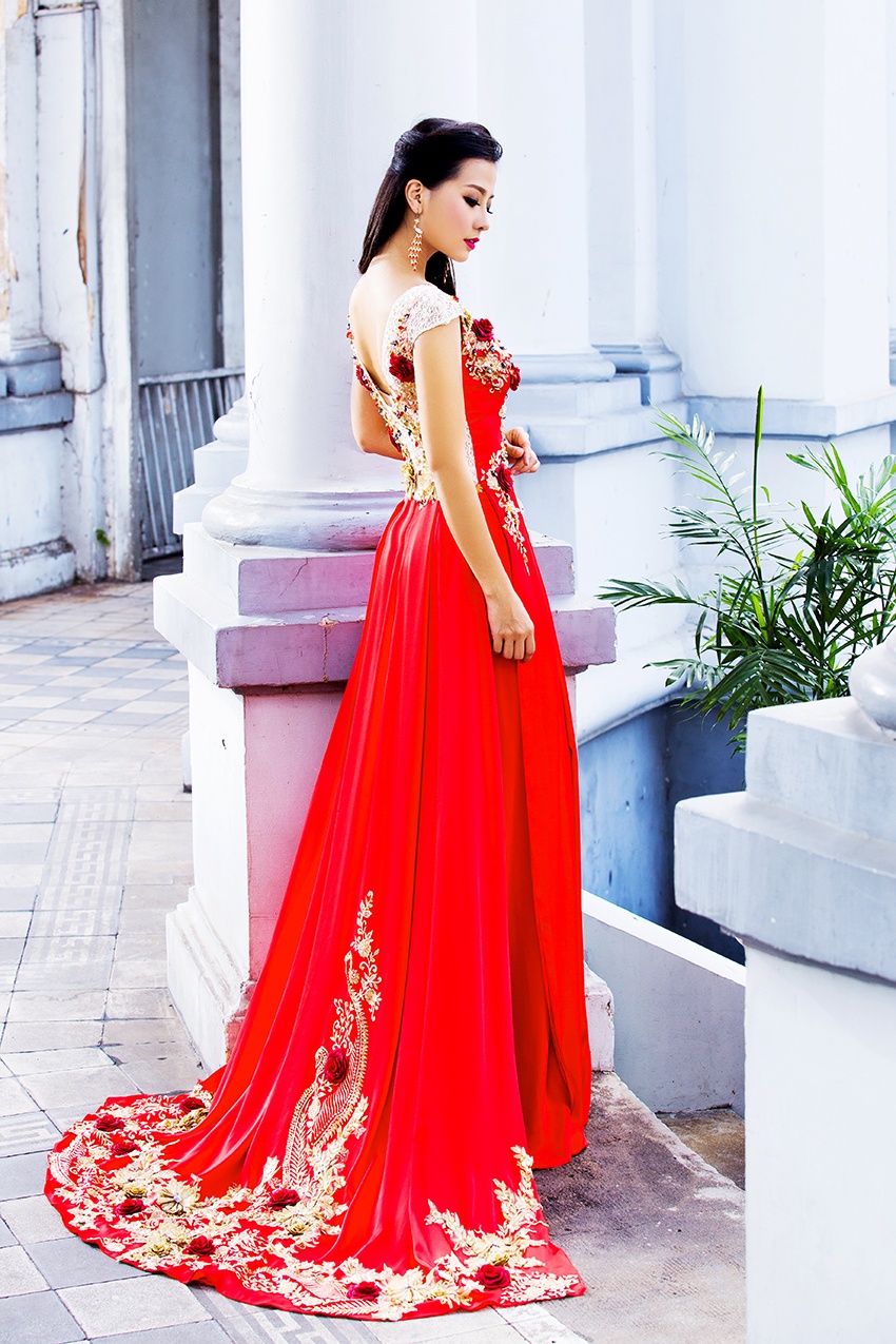 | Nổi bật trên nền vải voan đỏ rực rỡ là hoa hồng 3D ở thân trước, tà áo giúp trang phục thêm cuốn hút. |