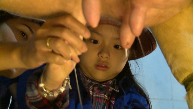 Các bé Suti, Totti và Bi lần đầu tiên trải nghiệm thử thách vắt sữa bò. Trong ảnh, con gái nhạc sĩ Minh Khang đặc biệt chú ý khi làm nhiệm vụ.
