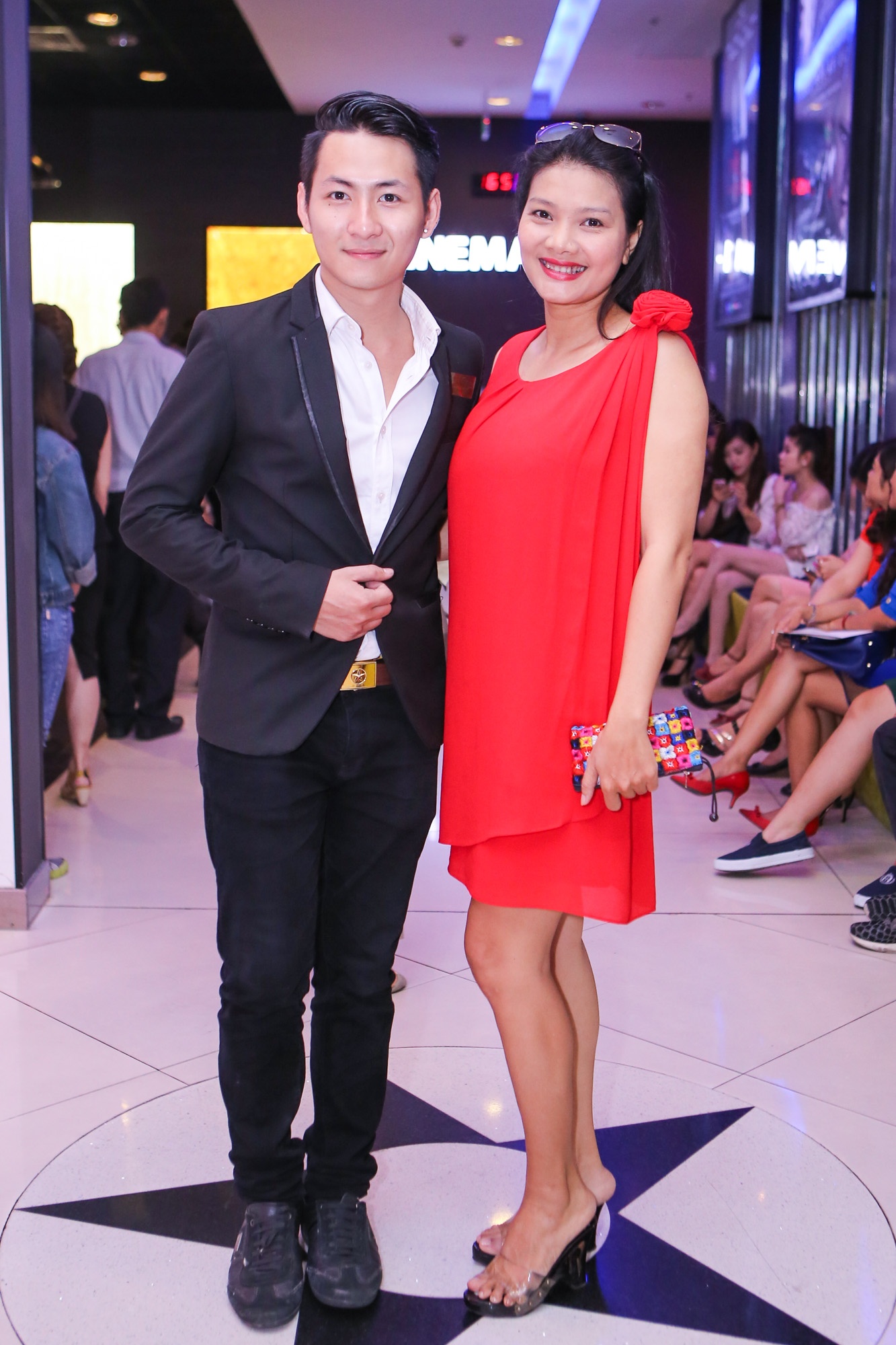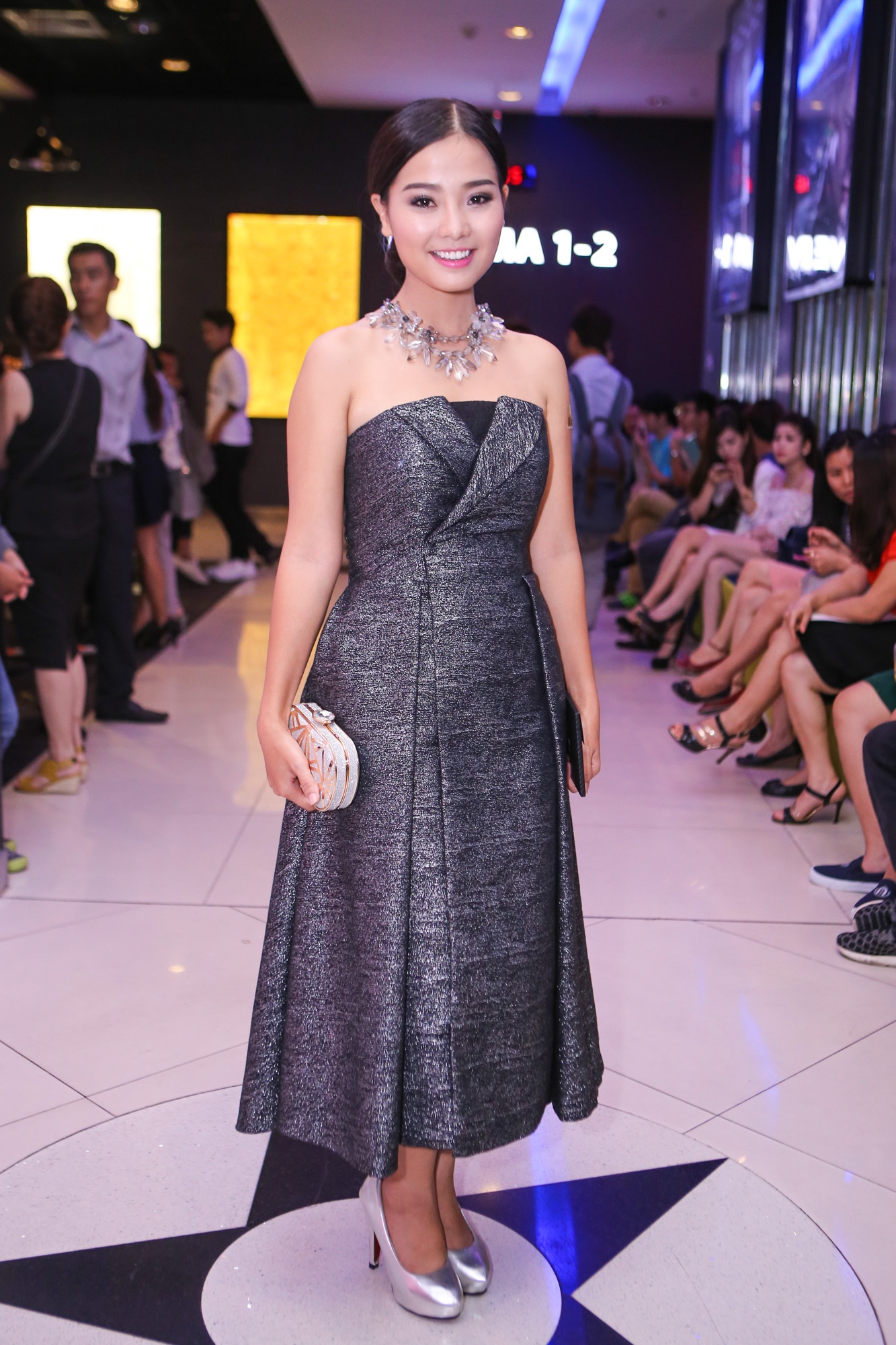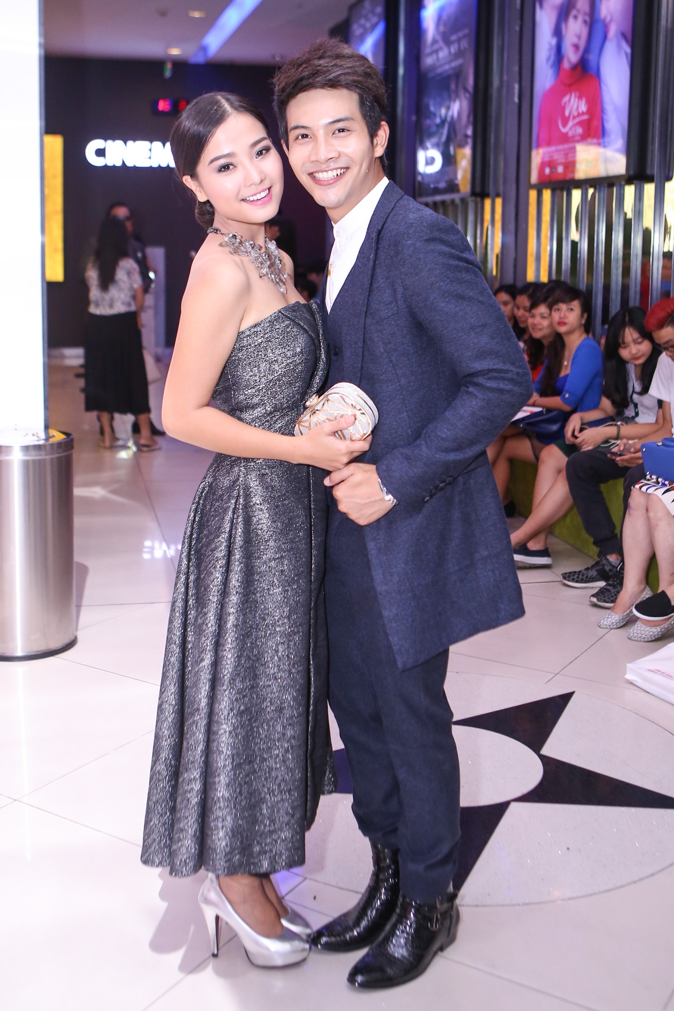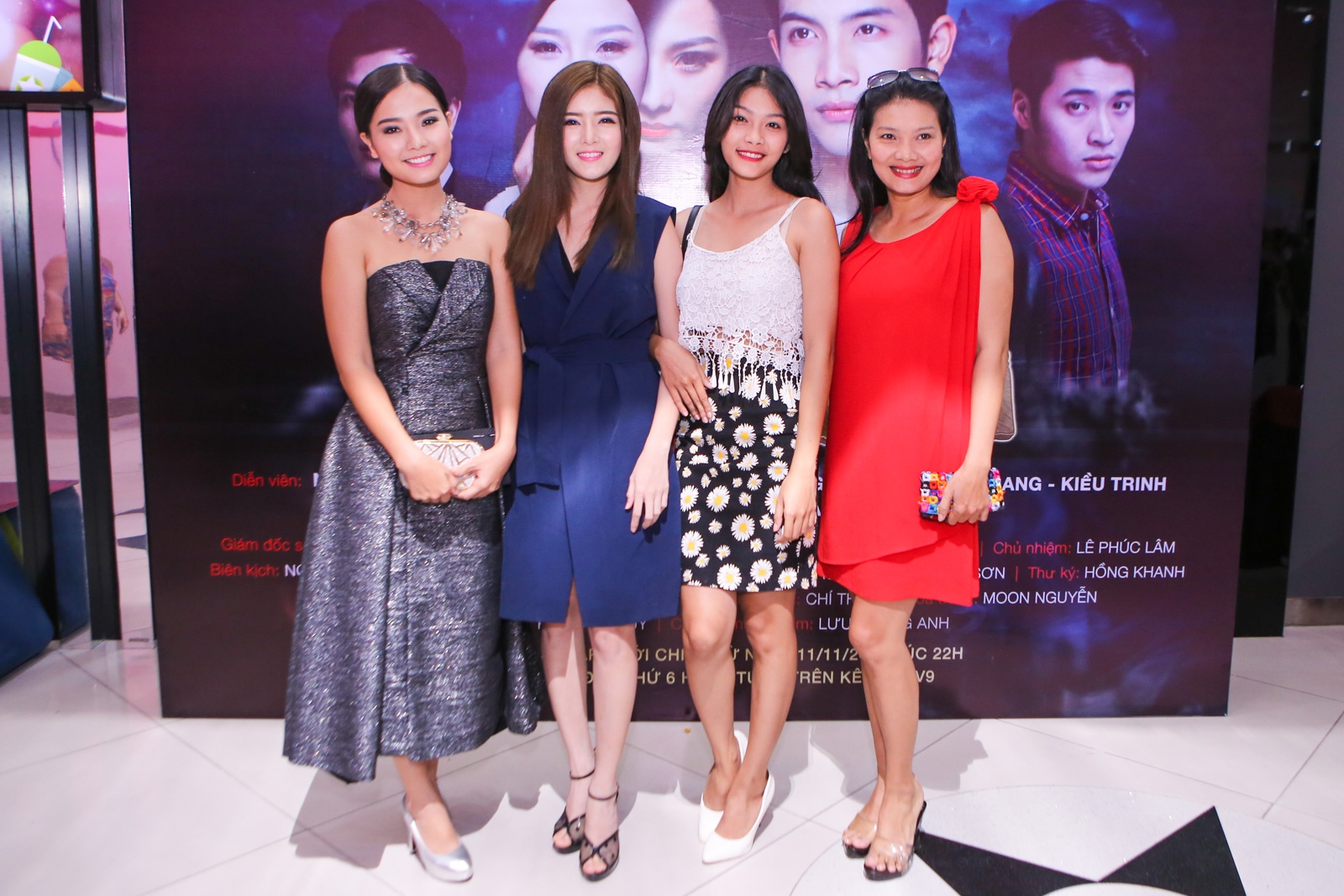 Con gái Kiều Trinh (áo hai dây trắng) tháp tùng mẹ đến sự kiện. Phim được phát sóng lúc 22h hàng ngày, từ 11/11 trên kênh HTV9.