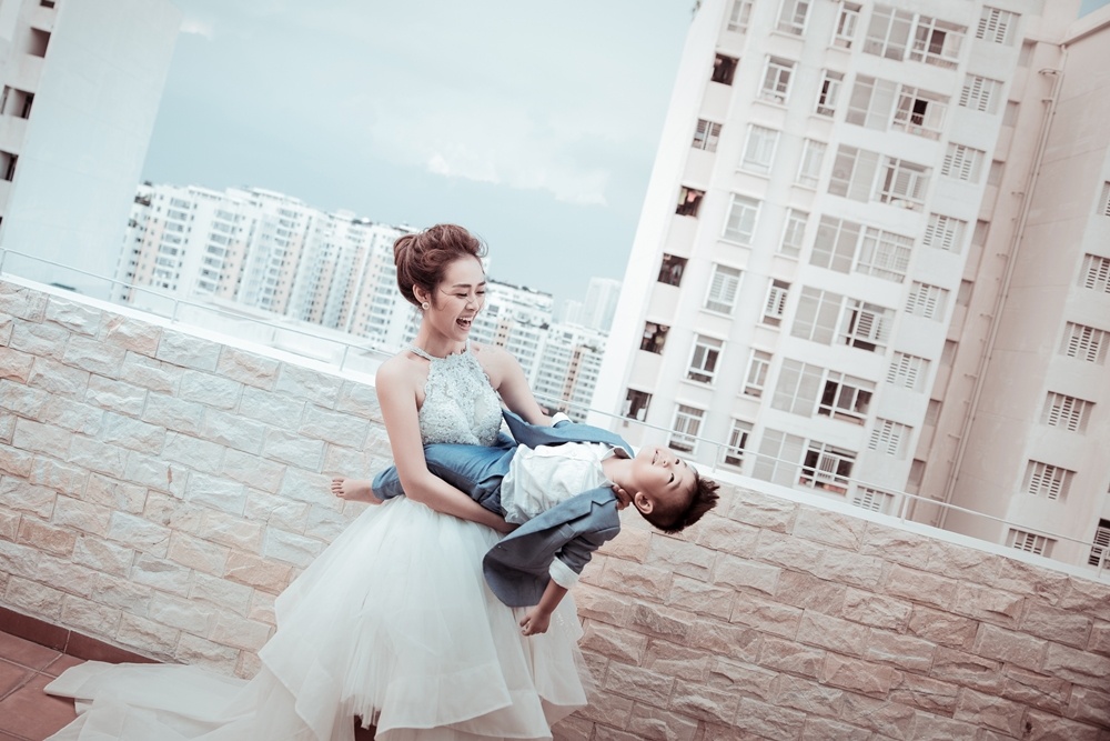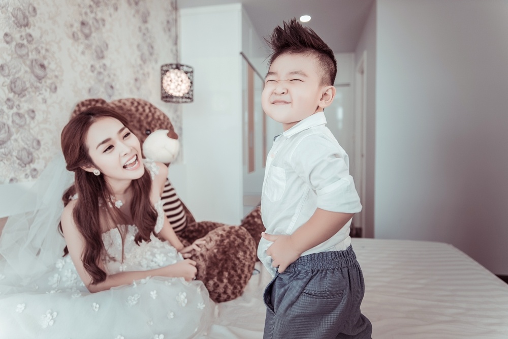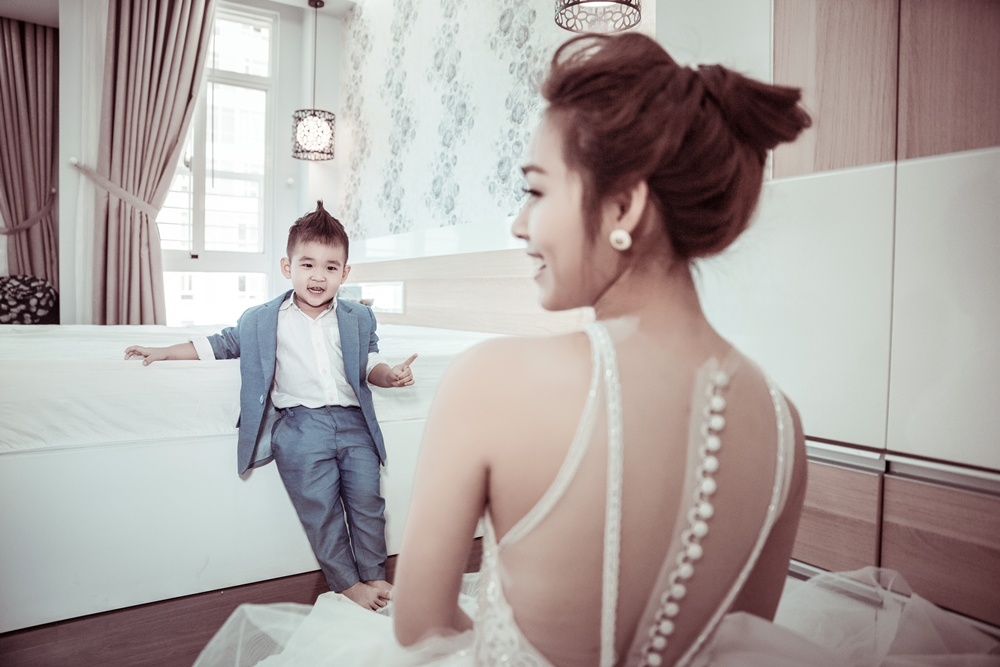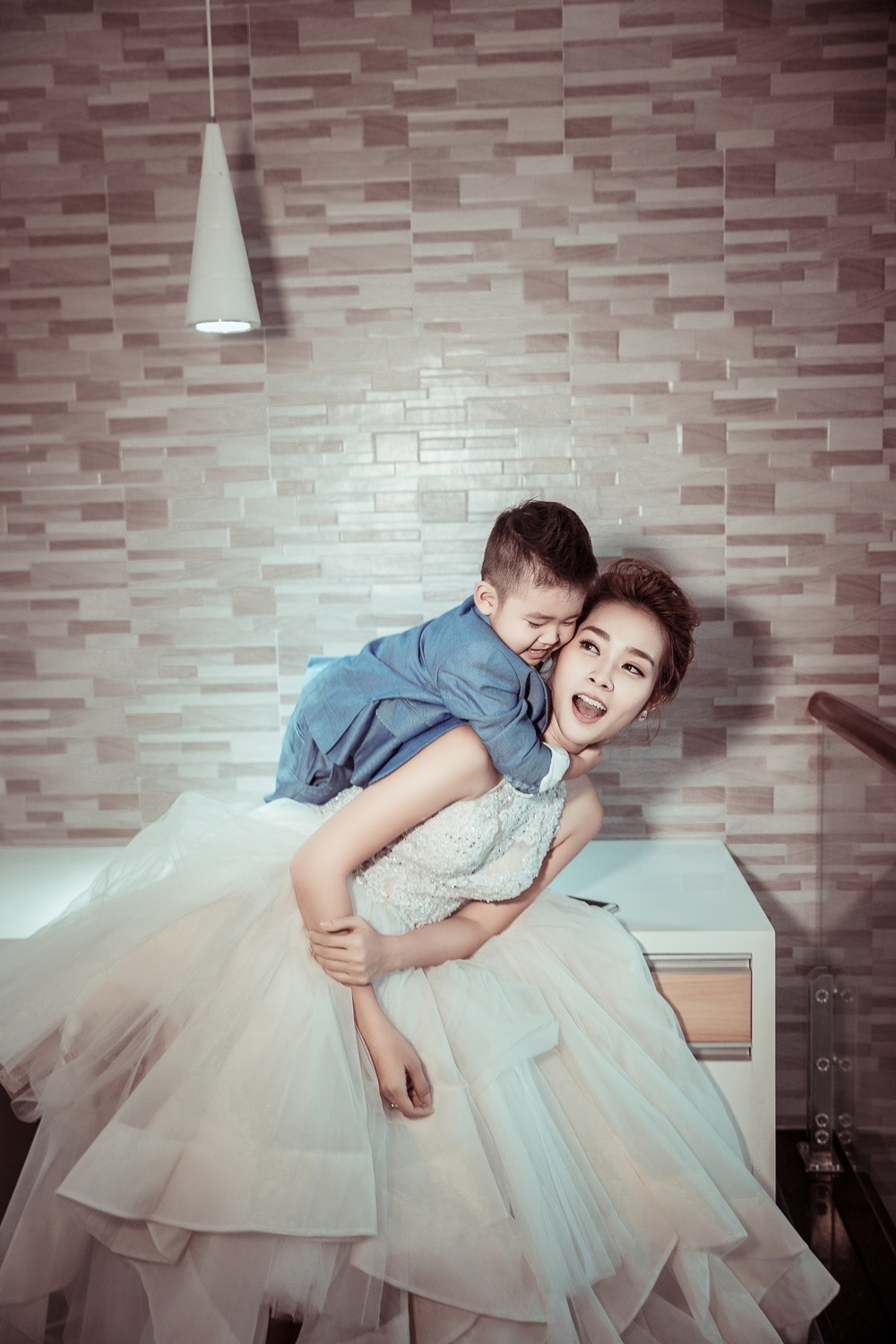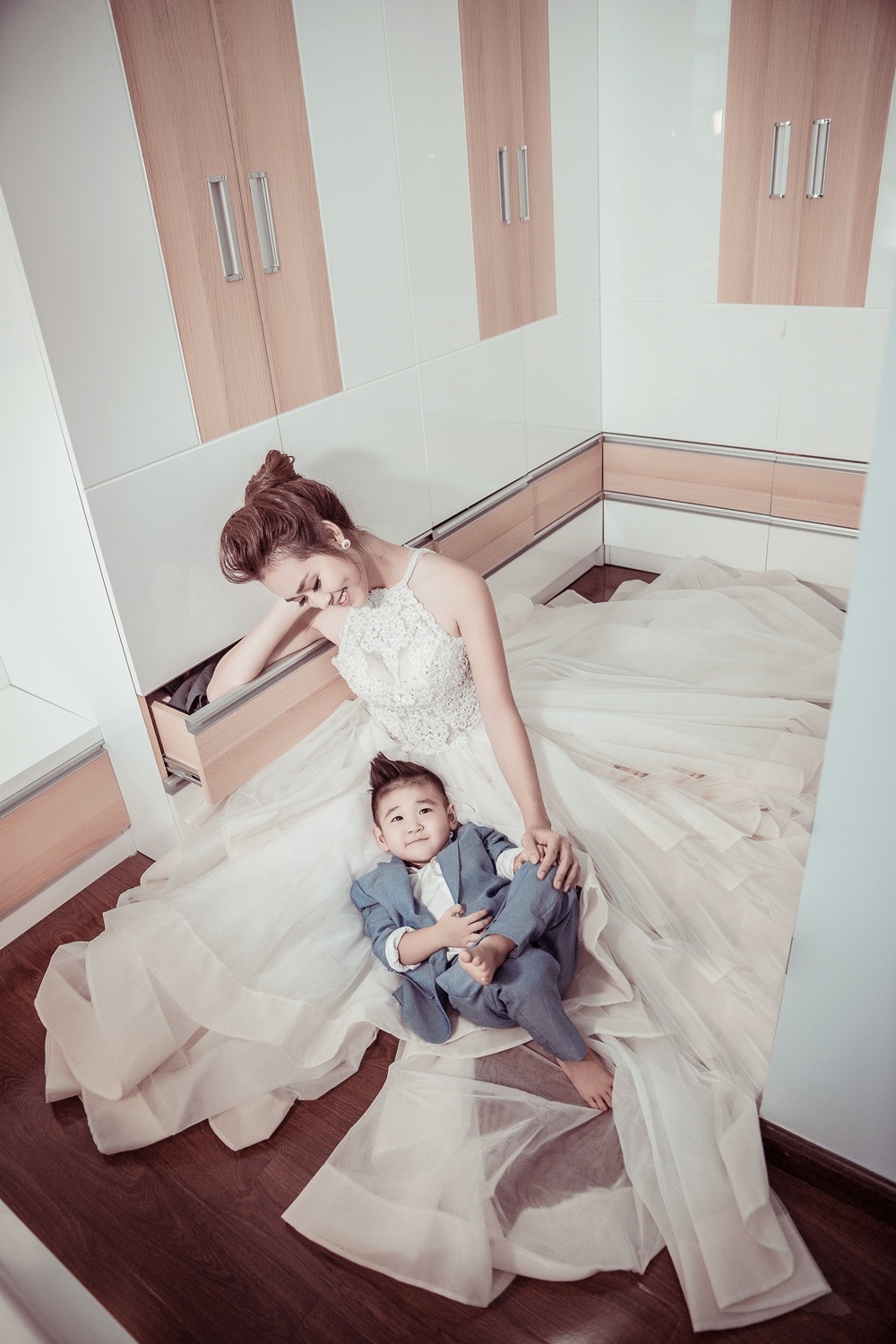 | Lần đầu tiên chụp ảnh, cậu nhóc 2 tuổi diễn xuất linh hoạt, ăn ý cùng mẹ. Người đẹp sinh năm 1993 diện trang phục cưới tông trắng nhẹ nhàng, nữ tính, tạo dáng tinh nghịch cùng bé Minh Khang. |
