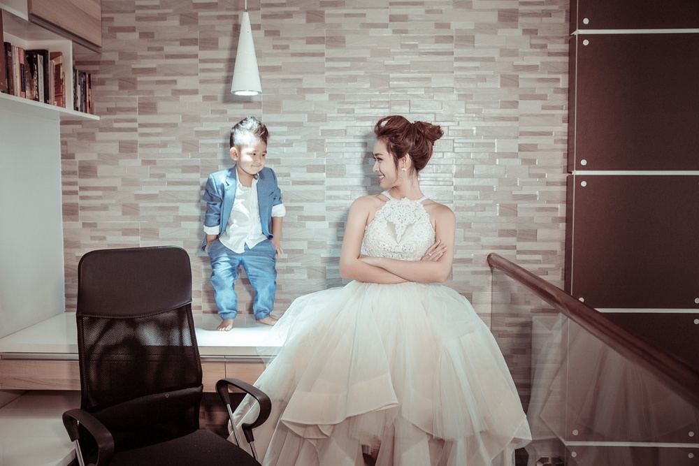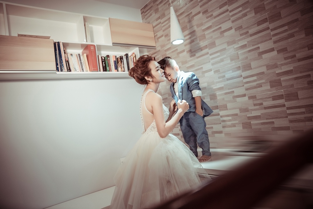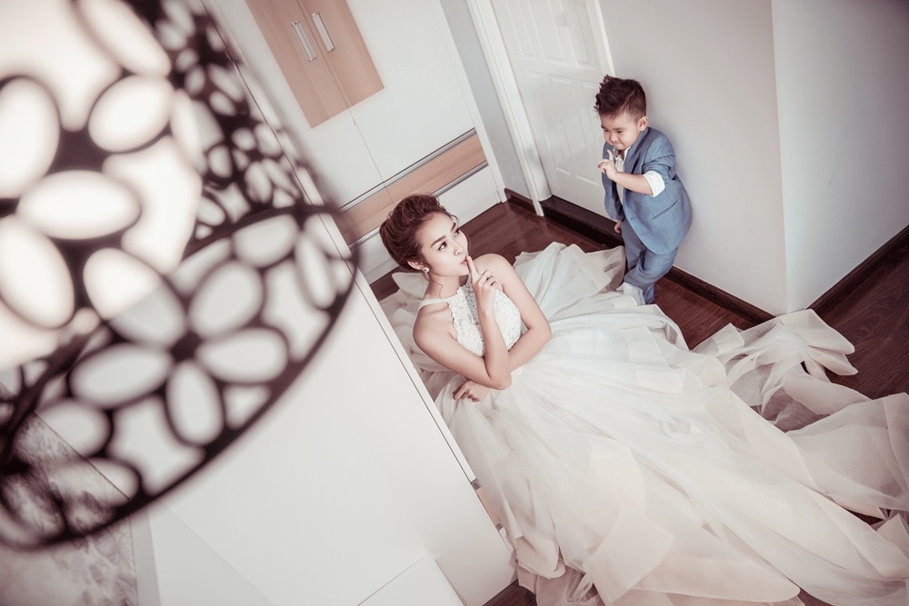 Nữ diễn viên sinh năm 1993 cùng con trai Minh Khang thực hiện bộ ảnh thời trang cưới mang tinh thần dễ thương, gần gũi.
