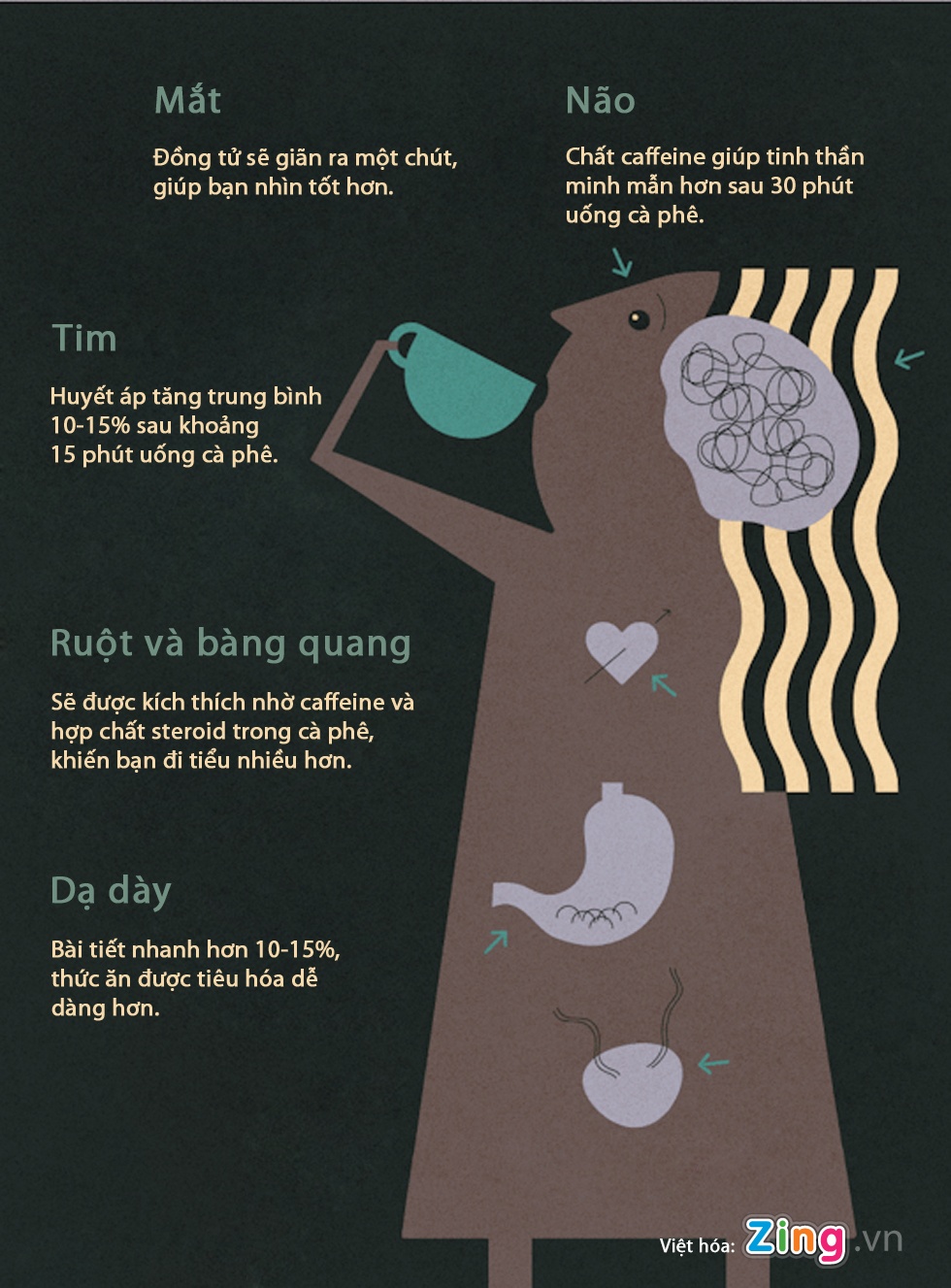 Theo tiến sĩ Nieca Goldberg, bác sĩ tim mạch tại Trung tâm Y tế Langone (Mỹ), cà phê kích thích hệ thống não bộ giải phóng sản xuất adrenaline, khiến đồng tử giãn nhẹ, giúp tầm nhìn sắc nét hơn.