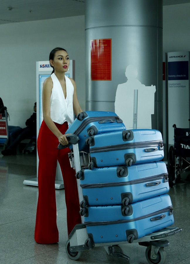 Hôm qua, cô có mặt ở sân bay buổi chiều để chuẩn bị thủ tục cho chuyến đi nhiều ngày. Diệu Huyền mang khá nhiều va li bao gồm quần áo, giày dép, phụ kiện... chuyên viên trang điểm Vĩnh Thụy sẽ là người đồng hành cùng cô tại các vòng thi. Diệu Huyền nhận được sự trợ giúp về trang phục của NTK Minh Tú.