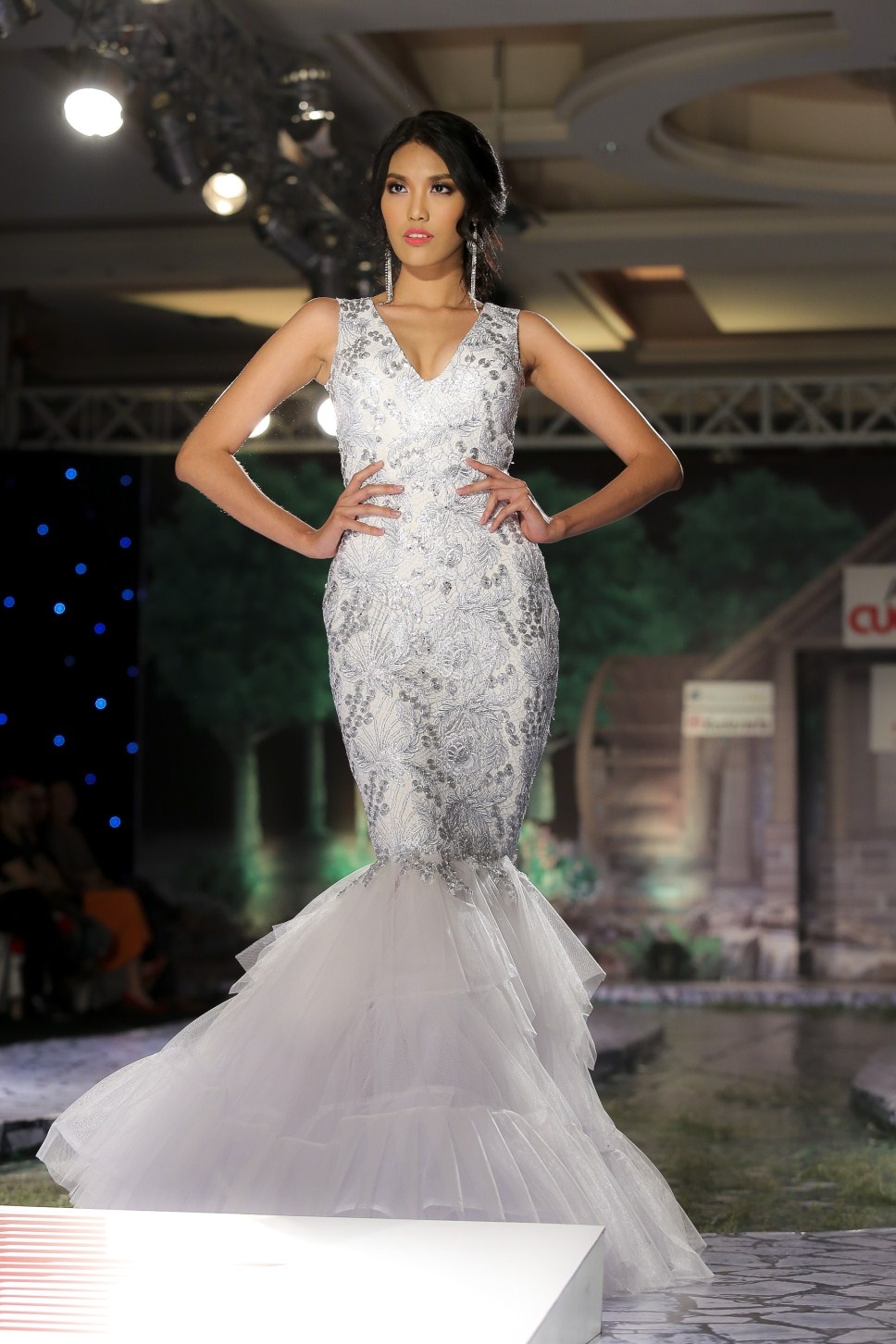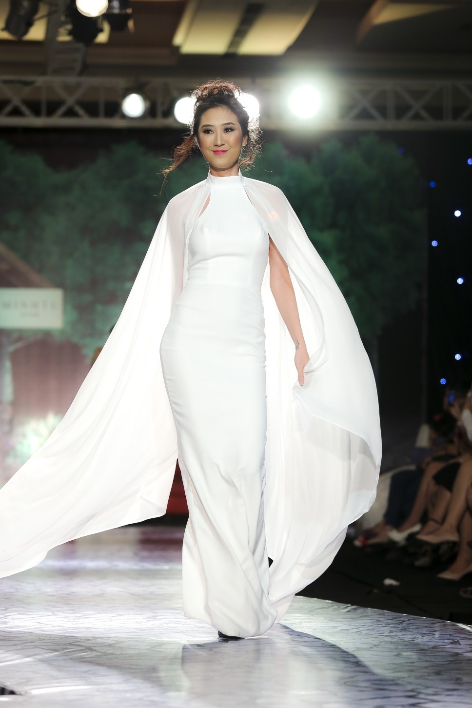 | Lan Khuê nổi bật hơn cả với vai trò vedette. Cô diện thiết kế gam trắng, dáng đầm đuôi cá, chất liệu ánh nhũ quyến rũ. Nữ người mẫu tự tin sải bước trên đường băng. |