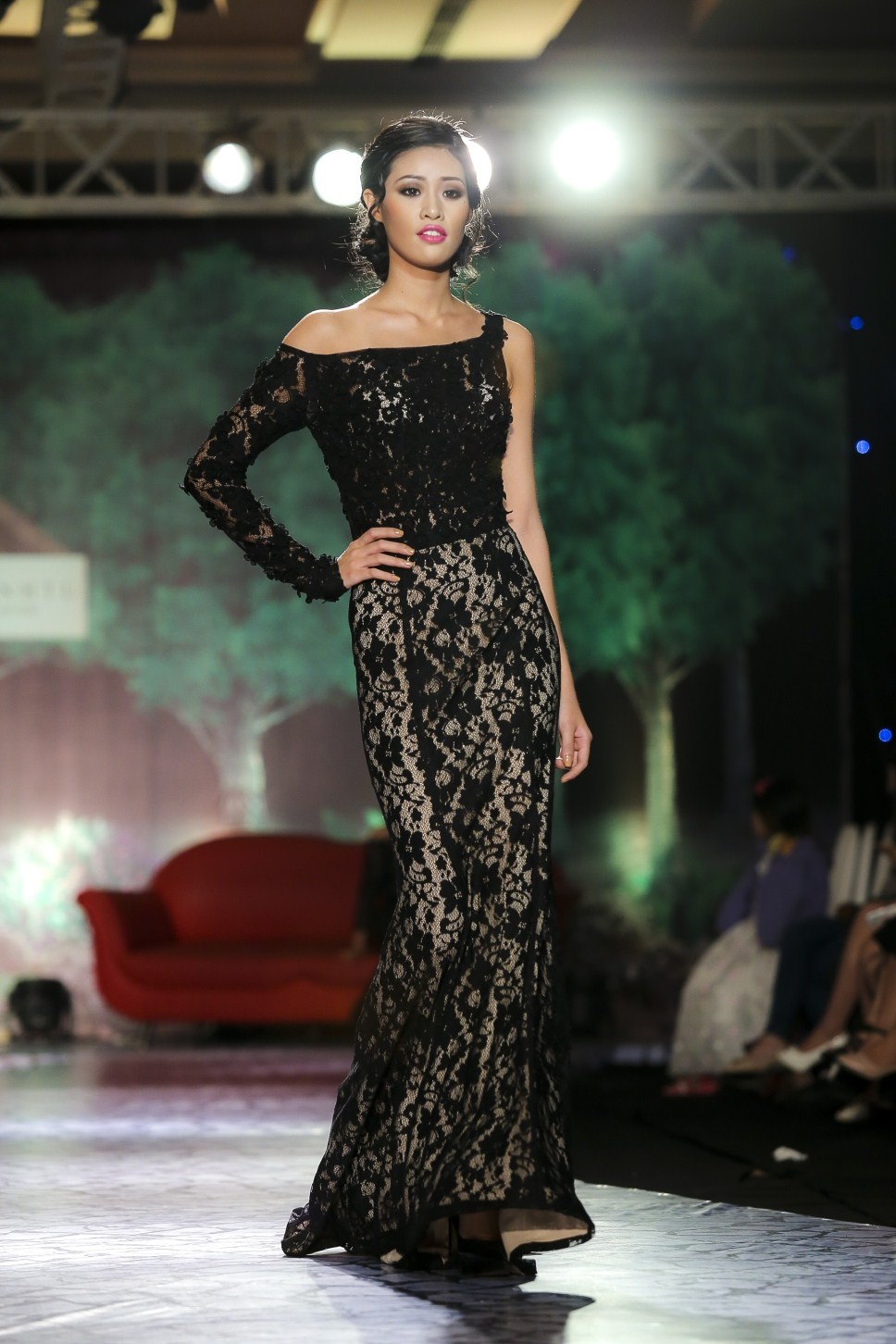 | Váy dạ hội tông màu đen của Minh Tú có chất liệu chủ yếu là voan ren. Phom dáng váy đuôi cá tăng sức hút ngoại hình cho người mẫu. |