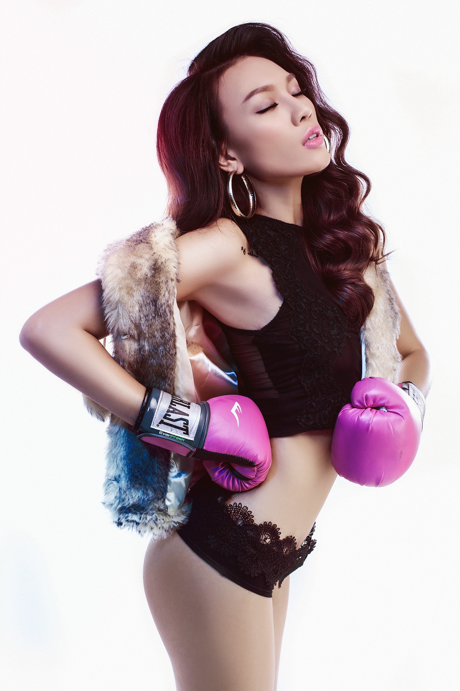 | Hình ảnh giải bạc Siêu mẫu Việt Nam thêm phần nổi bật khi cô diện nội y tối màu chất liệu xuyên thấu, tay đeo găng đấm bốc cá tính, áo lông khoác ngoài điệu đàng. |