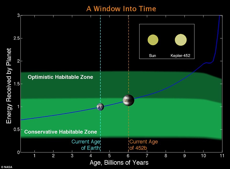 Khi quan sát Kepler-452, ngôi sao riêng của Kepler-452b, giới khoa học phát hiện ra nó có rất nhiều điểm tương đồng với mặt trời của chúng ta. Kepler-452 là một ngôi sao đã tồn tại 6 tỷ năm, nhiều tuổi hơn mặt trời là 1,5 tỷ năm. Nhiệt độ của nó tương đương với mặt trời, song đường kính lớn hơn 10% và độ sáng cao hơn 20%. Ảnh: NASA