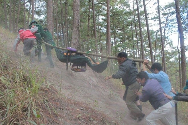 | Lực lượng chức năng khiêng thi thể nạn nhân về bệnh viện. Ảnh: T.N. |