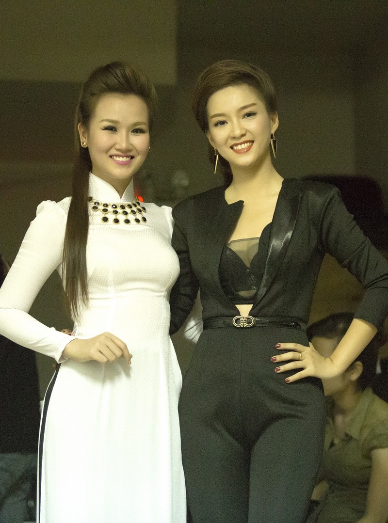| Đinh Hương rạng rỡ bên Võ Hạ Trâm ở phía sau cánh gà. |