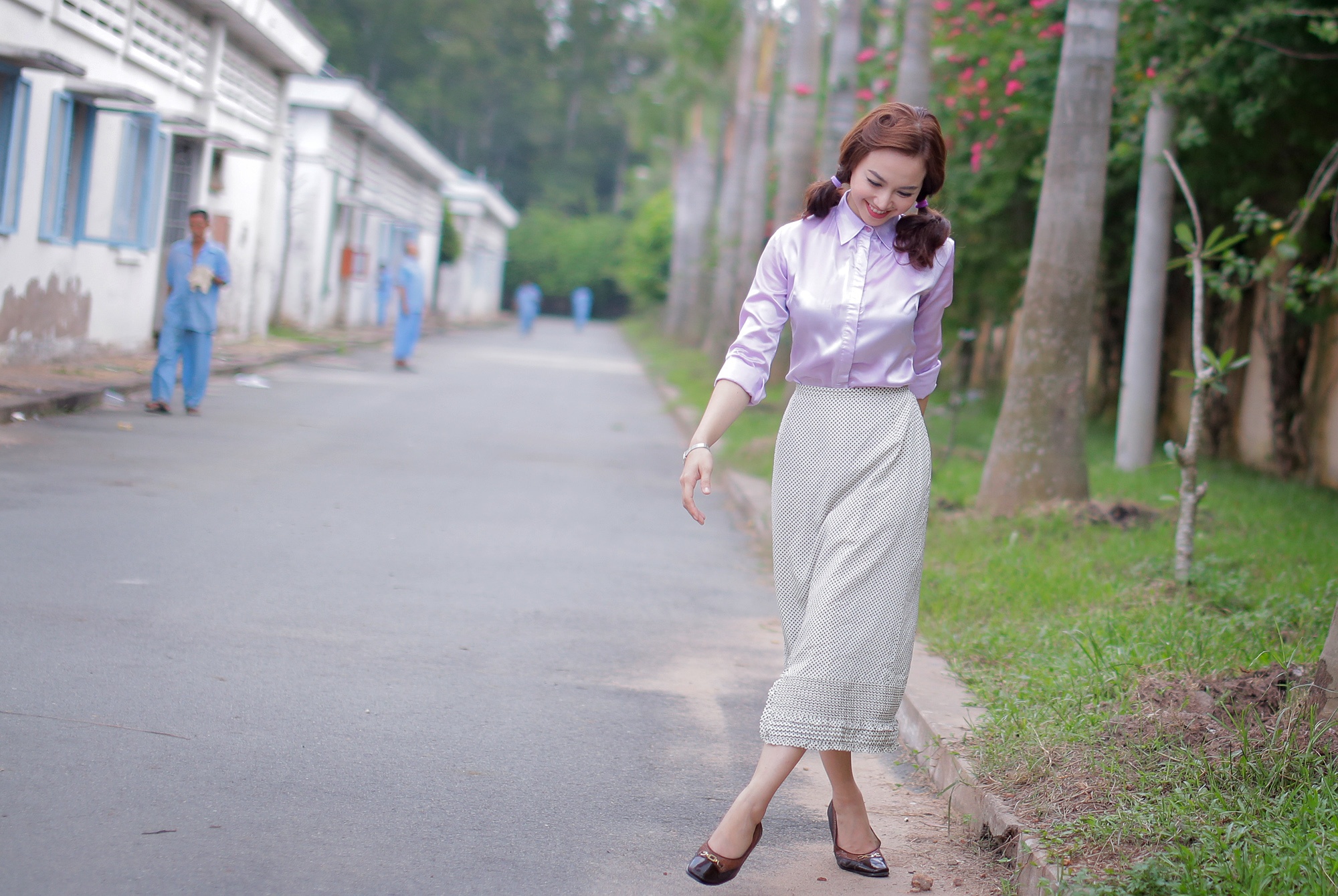 Trong một cảnh quay khác ở đại lộ Võ Văn Kiệt, TP HCM, cô buộc phải chạy theo Thái Hòa vài trăm mét, tuy nhiên, đạo diễn không hài lòng nên buộc diễn viên phải thực hiện hơn chục lần. |